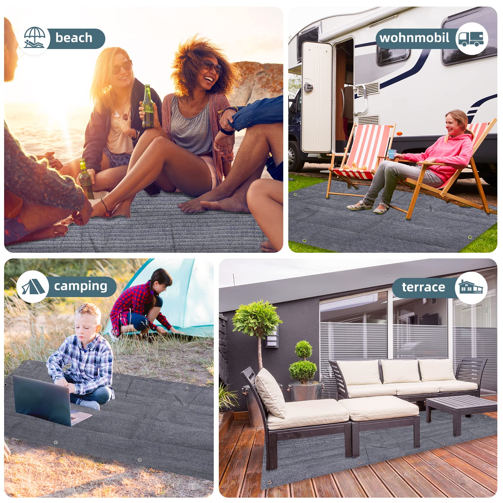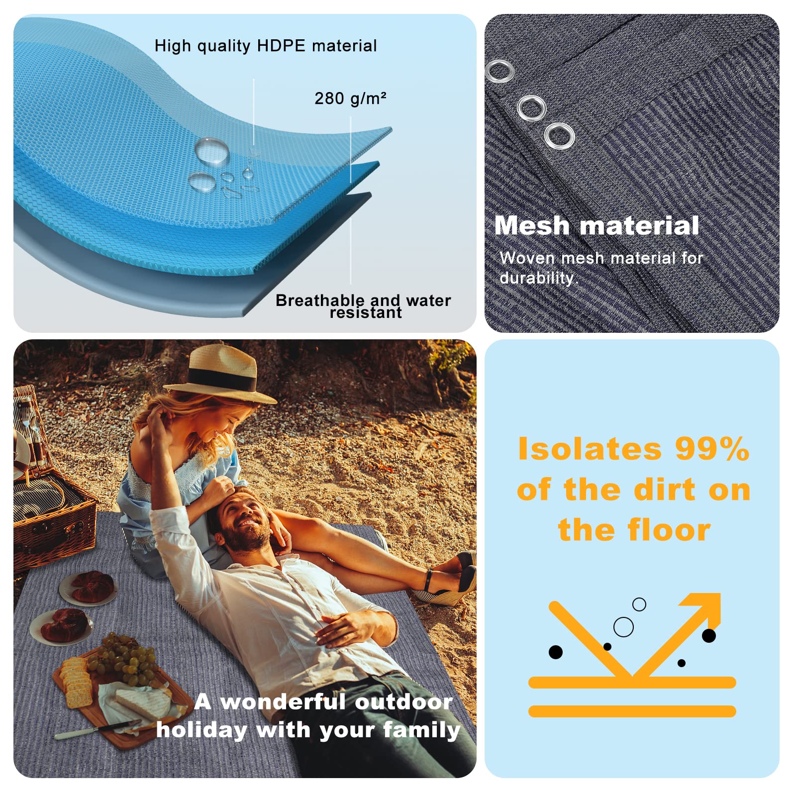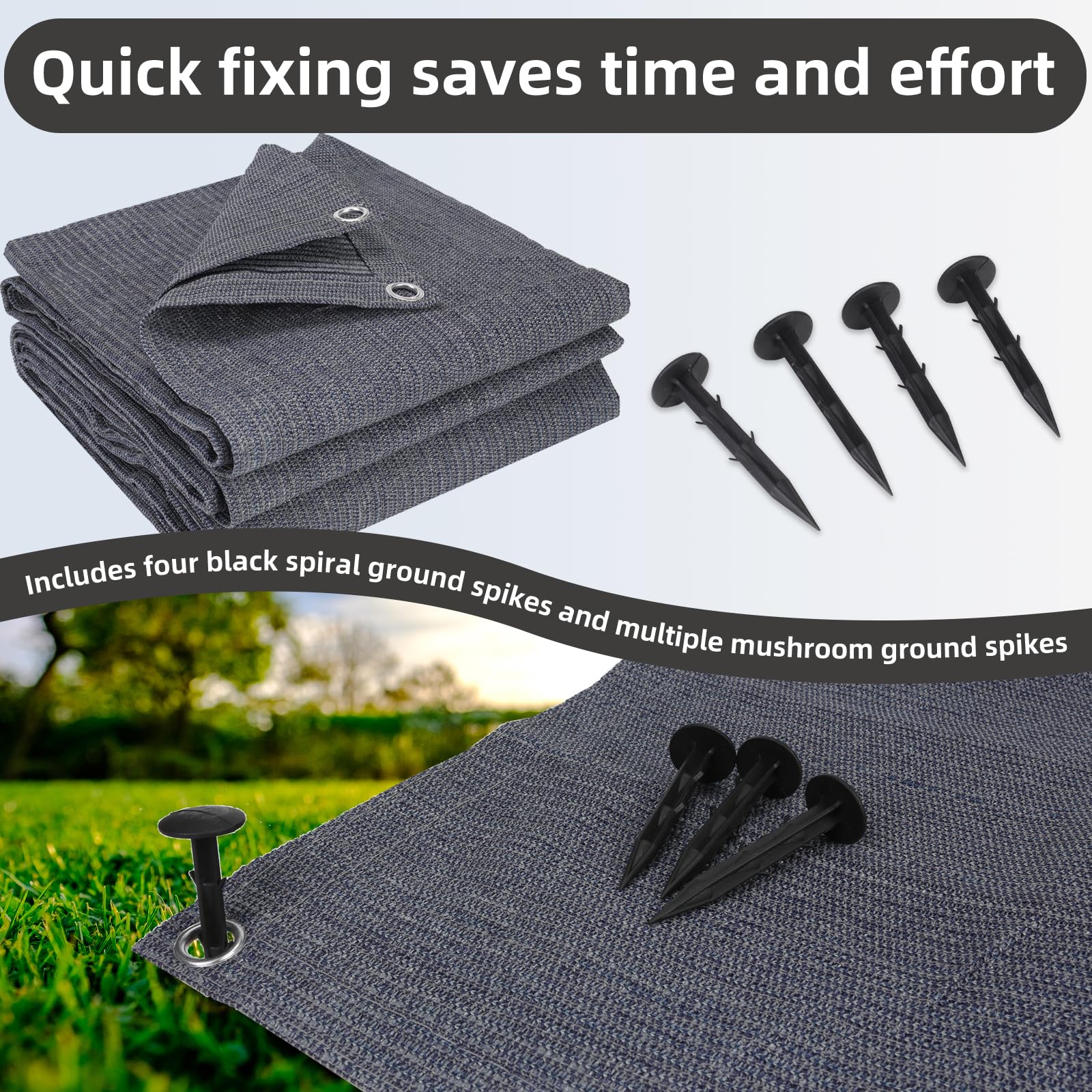 ["High-quality Material】FoundGo awning carpet is made of 280g/㎡ HDPE material, which is wear-resistant, anti-fouling, and breathable. The sunshade carpet is durable, non-slip, and moisture resistant. It is also UV resistant and does not fade easily."
