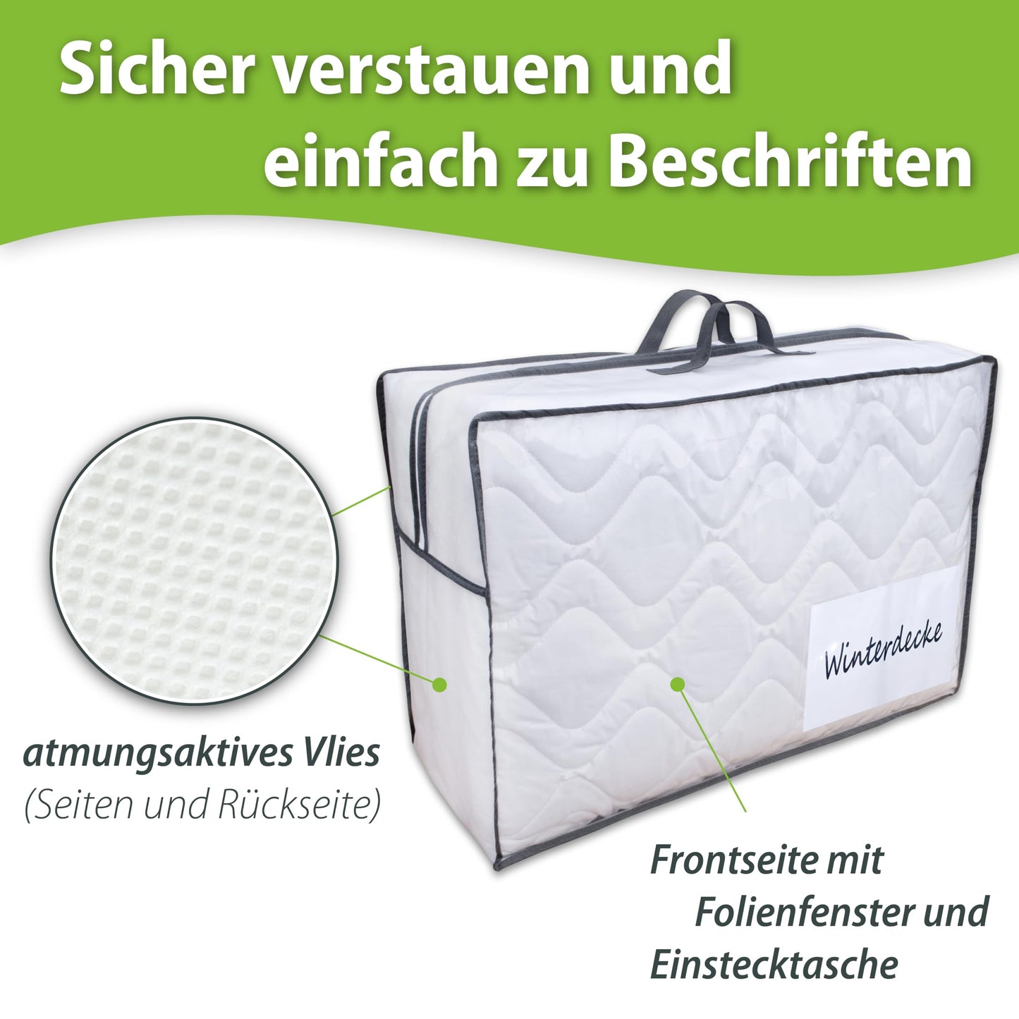 ["Practical storage space: With dimensions of 25.6 inches wide, 17.7 inches high, 9.8 inches deep, the bags provide space for duvets, pillows, and more. Ideal for quickly switching between summer and winter bedding.","Easy handling: With a wide-opening zipper for easy filling. Thanks to reinforced edges and handles, transportation is a breeze. Durable bag for long-term use.","Clear view thanks to the window: The front of the bed bag has a transparent window for easy identification of the contents. Perfect for organized storage.","Breathable material: Made of lightweight non-woven fabric, the lightweight storage box offers quick and optimal protection during storage.","Versatile use: Whether for moving, storage, or laundry storage, the carrying bags save space and can be easily labeled through insertion windows on the front and side."]