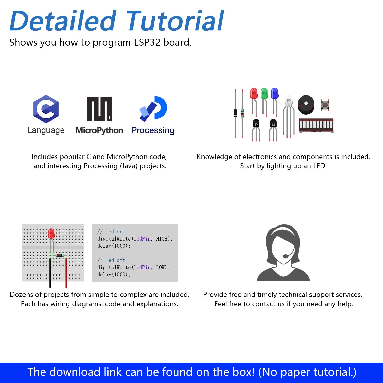["ESP32 WROVER: Dual-core 32-bit microprocessor up to 240 MHz, 4 MB Flash, 8 MB PSRAM, onboard 2.4 GHz Wi-Fi and Bluetooth 4.2 (LE), camera","3 Sets of Codes: MicroPython, C and Processing (Java), Processing codes run on computers to provide graphical interfaces","795-Page Detailed Tutorial in Total: Provides step-by-step guide with basic electronics and components knowledge (The download link can be found on the product box) (No paper tutorial)","240 Items for 122 Projects: Each project has schematics, wiring diagrams, complete code and detailed explanations","1GB Memory Card: Can be inserted into the ESP32 board to read and write files (Included in this kit)"]