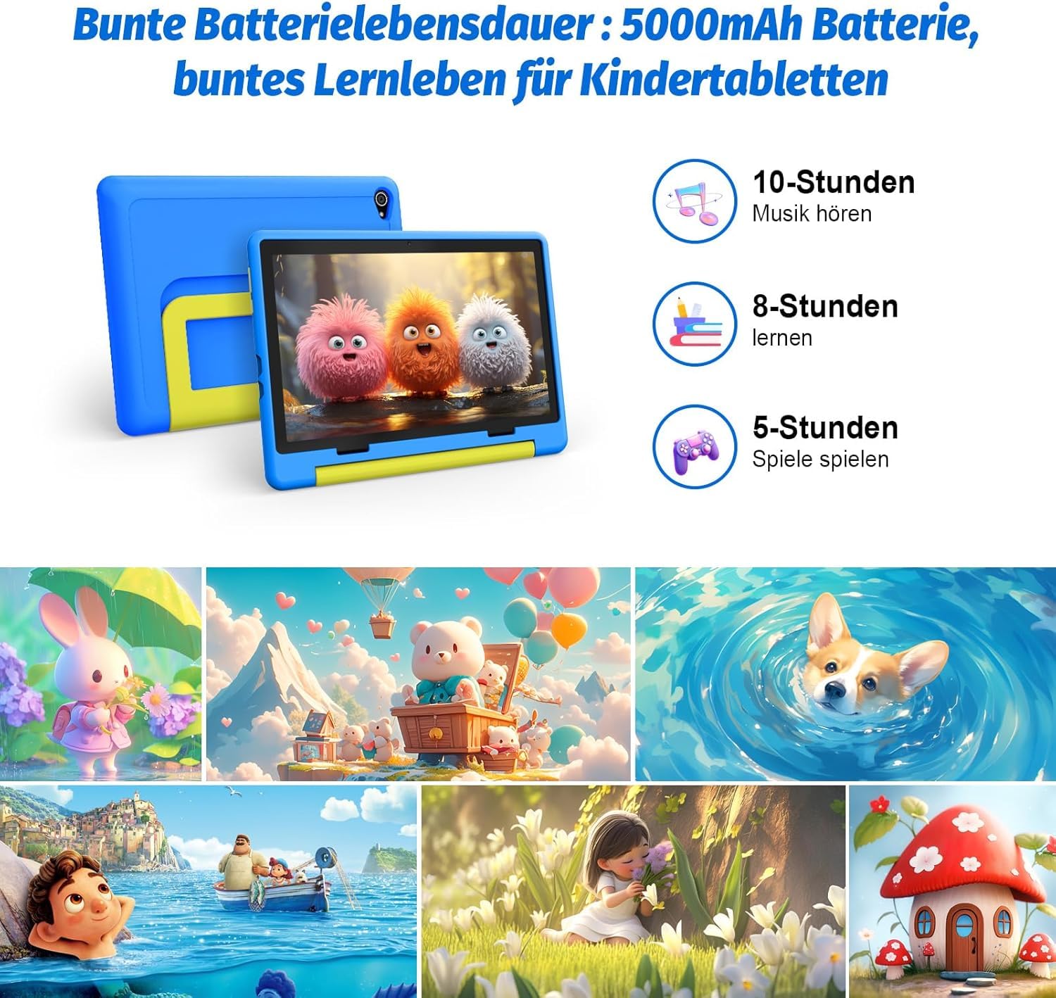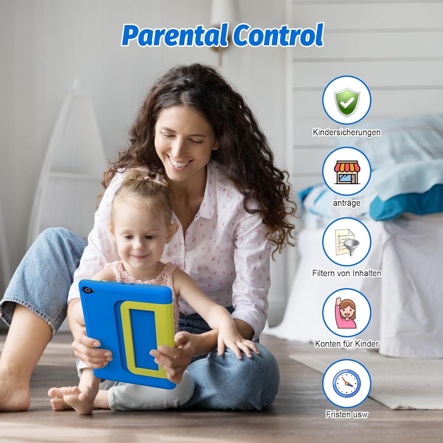 ["【Android 14 Tablet with 8(3+5)GB+64GB+1TB Storage】: The kids tablet 10.1 inch has been further improved and features open and personalized settings as well as more extensive privacy settings. This Android 14 tablet for kids comes with 8GB of RAM and 64GB of storage. 64GB of storage space is enough to store your favorite movies, photos, and apps. The Android 14 kids tablet also supports up to 1TB TF card to expand storage and provide additional space for more data and files.","【Convenient and User-Friendly Parental Control System】: This kids tablet comes with a parental control mode. Parents can set screen usage time for their kids to prevent excessive eye strain. The tablet also allows parents to control their kids' access to specific apps and automatically block inappropriate content. Parents can even remotely monitor their kids' device usage when they are not nearby. It has a user-friendly interface that allows parents to easily configure and manage settings.","【5MP + 8MP Dual Camera + WLAN 6 + Bluetooth 5.0】: The Android 14 tablet is equipped with a 5MP+8MP dual camera, allowing for excellent photos and clear video calls. Additionally, the kids tablet features WLAN and Bluetooth connectivity to ensure seamless networking and device compatibility. It can download a variety of educational apps, allowing kids to immerse themselves in e-books, drawing, and note-taking for an impressive learning experience.","【5000mAh Battery + 10.1 Inch 1280*800 HD Screen】: This tablet for kids comes with a 5000mAh battery, allowing kids longer periods of learning and entertainment. It also features a 1280 x 800 IPS high-resolution screen that reduces eye strain and blue light exposure, protecting children's vision during extended use. It is an excellent choice for kids during long car rides and for educational purposes.","【Ideal Kids Tablet Durability and Convenience】: The Android 14 kids tablet is equipped with an anti-shock protective case. The lightweight and sturdy case protects the tablet for kids from scratches, dirt, and other potential damages. This tablet poses no unnecessary risks. Kids can easily access a variety of content on the tablet, helping them learn new skills anywhere."]