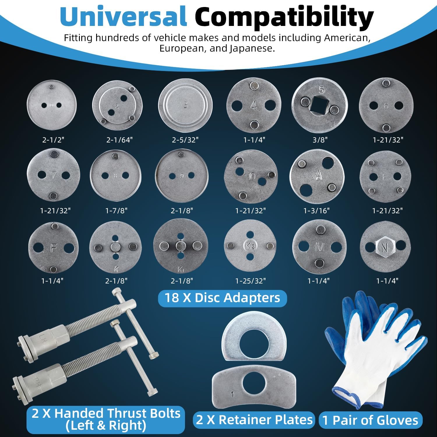 "Package includes: 1 x right-handed thread spindle; 1 x left-handed thread spindle; 18 x adapters for common brake systems (with Nue VAG 3 Pin Adapter); 2 x retention plate; 1 x plastic case"]