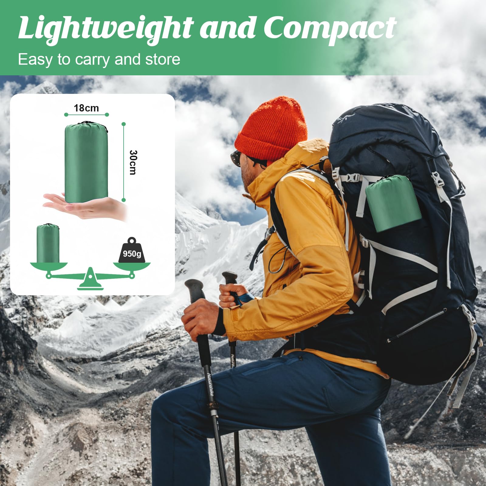 ["Portable Ultralight Camping Mat"]Lightweight, small in size, and comes with an organizer bag, very easy to carry. Inflated size is 195 x 64 x 12 CM, folded size is 30 x 18 CM lightweight air mattress, weight is about 950g. It can easily be hung on the side of a backpack or stored in your backpack, making your camping easier, best for camping, backpacking, hiking, outdoor adventures, and travel.