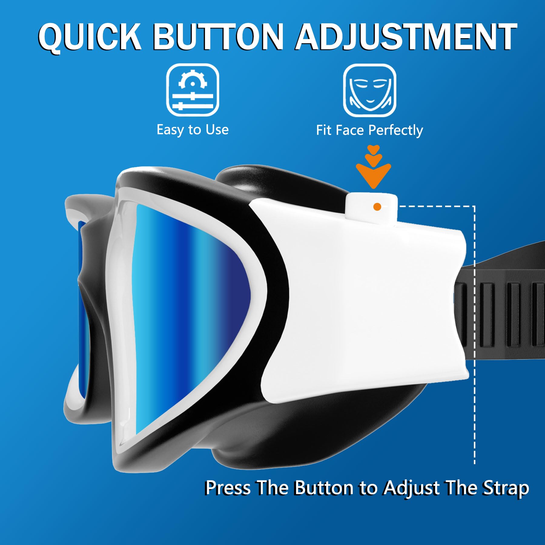 No leaking and comfortable fit: The ergonomic 3D frame design adapts to different face shapes, preventing discomfort or marks on your face. The adult goggles feature high-quality silicone seals that create a strong seal, preventing leaks and irritation, and providing a snug and comfortable fit without leaving 'raccoon eyes'.