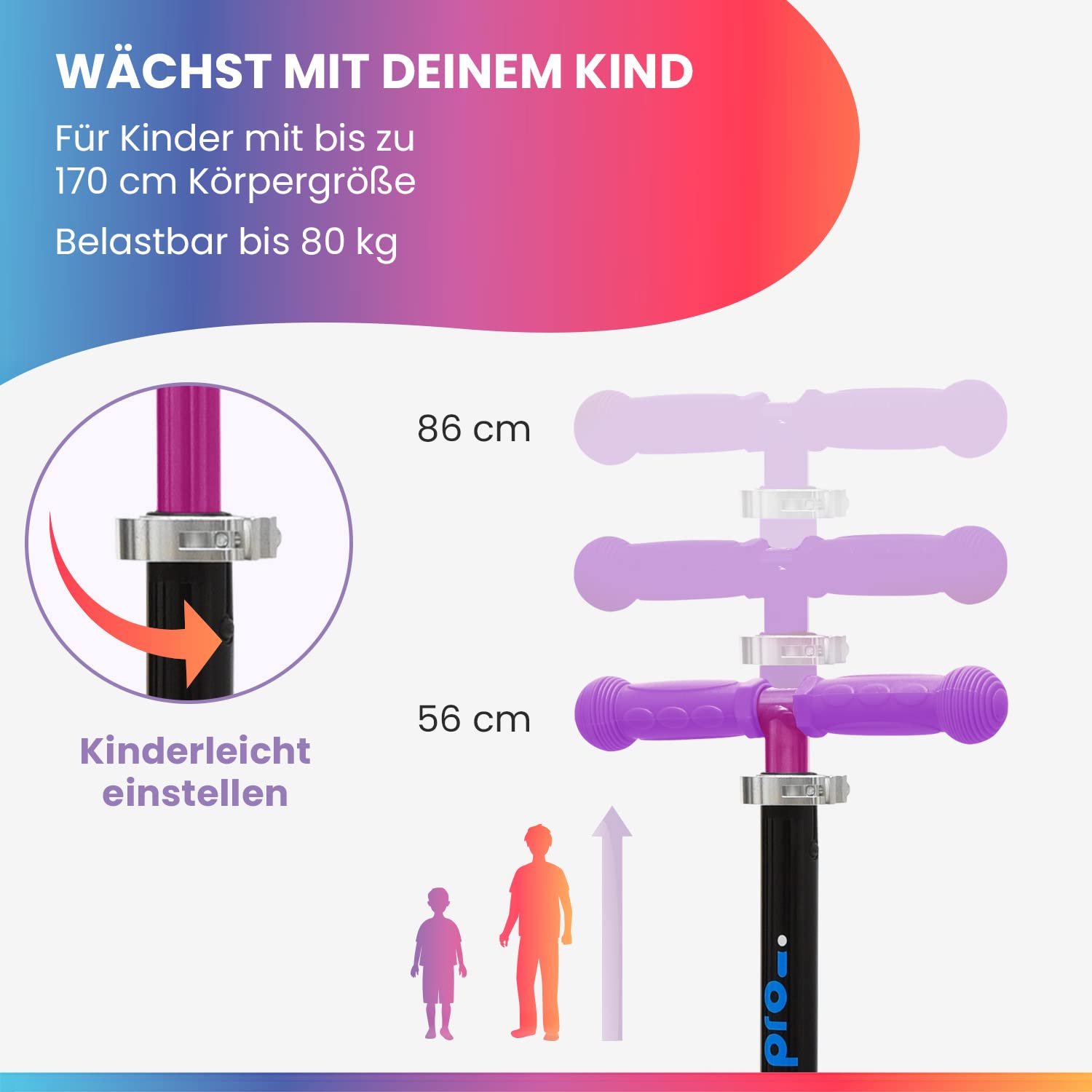 ["HAPPY CHILDHOOD: The battery-free, dynamo-powered wheels on this scooter for kids aged 6 and up are eye-catching. The colorful LED wheels light up in a variety of bright, cheerful colors as children ride","HEIGHT ADJUSTABLE & FOLDABLE: This lightweight and compact scooter for kids 5 years old has a height-adjustable handlebar from 56-86 cm, allowing children to ride as they grow taller. The folding scooter supports up to 80 kg and provides stability","CHILD SCOOTER SAFE AND STURDY: The combination of strong and stable design and gravity steering allows your children to steer this kick scooter easily and safely. This scooter is suitable for children aged 5 and up","VERSATILE RIDING: We want every child to enjoy their outdoor time safely with this mini scooter. That's why our kids scooter is designed to ride safely on various surfaces like concrete, asphalt, and wooden floors"]