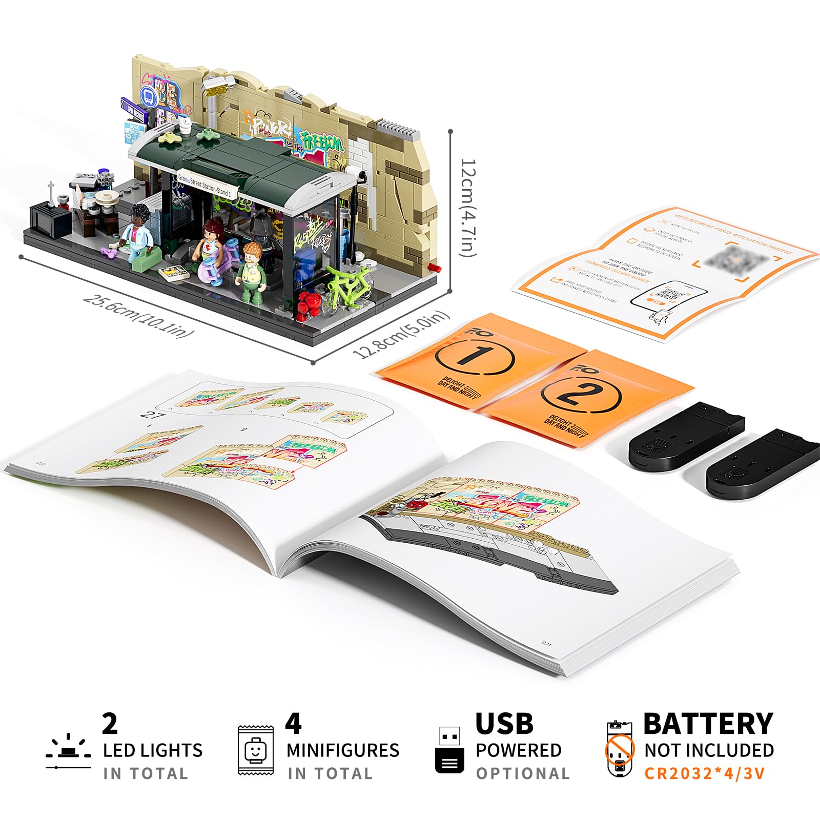 FUNWHOLE Graffiti Bus Stop Building Blocks Lighting Decoration, Modular Building Street Fusion City Town Bus Station, 516Pcs, Suitable for Adults and Street Style Enthusiasts, F9066.