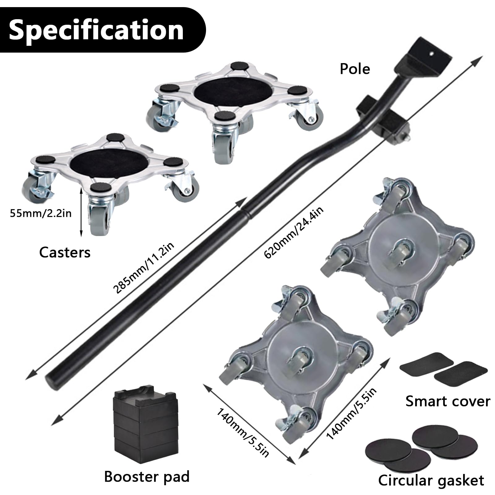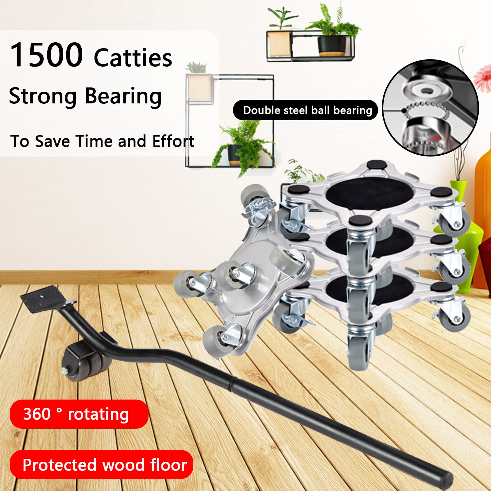 🔰【Furniture Dolly Moving Dolly】: This furniture cart for moving provides easy mobility and maneuverability when collecting and transporting heavy items. Package: 4 * Dollies, 1 * Lifter (Longer rod with double cross-section, total length 62 cm), 2 * Protective covers, 4 * Elevation pads, 4 * Anti-slip mats. The total weight capacity of the entire furniture transport tool set is 2204 lbs. The 360° swivel handle allows you to easily move furniture in any direction.