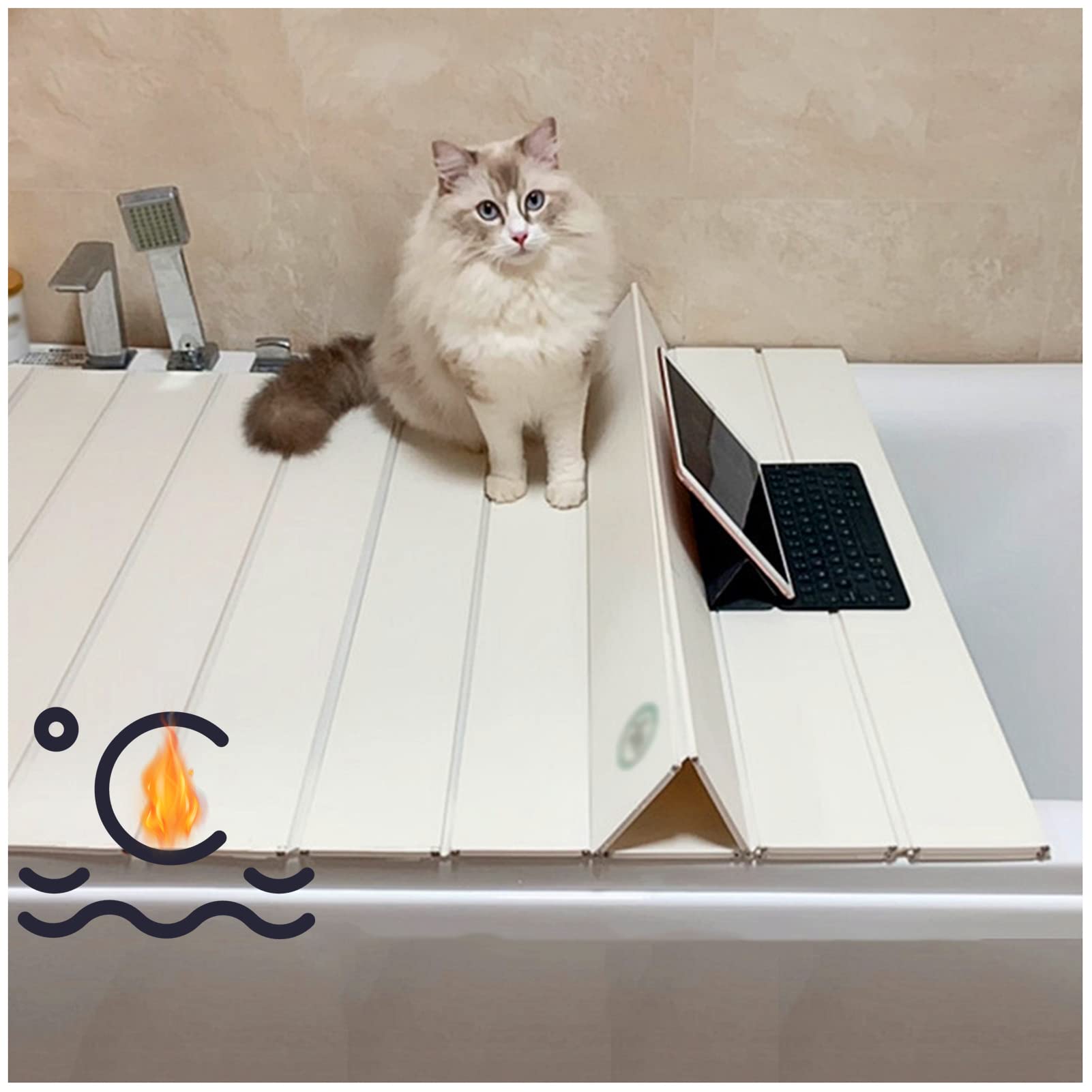 ["PVC bathtub cover: PVC moisture-resistant, great for use in the bathroom. The plug is made of silicone and does not break after multiple folds. The thickness is 0.7 cm, making it durable and resistant to deformation and damage after repeated bending.","Insulation cover: The bathtub cover is placed on the bathtub to keep the water warm, reduce temperature loss, and maintain a constant temperature. Warm water can help relieve fatigue and provide you and your family with a good bathing experience.","Foldable: The bathtub cover can be laid flat and folded into different areas. This flexible folding method makes the bathtub cover suitable for various bathtubs and people of different body types. The bathtub cover prevents dust from entering your bathtub when not in use.","Bathtub tray: It can hold up to 6 kg and can be used as a surface for organizing sanitary items. The cover can be folded into a triangle or similar shape, allowing you to enjoy the practical tray function by placing it above the bathtub. The bath board can hold pills, books, coffee, wine, shower gel, shampoo, etc.","The Perfect Gift: The bathtub bridge tray is the perfect choice to enjoy your time in the bathroom. It can be a great Christmas gift for relatives and friends. It is recommended for baths, milk baths, flower baths, and spa accessories."]