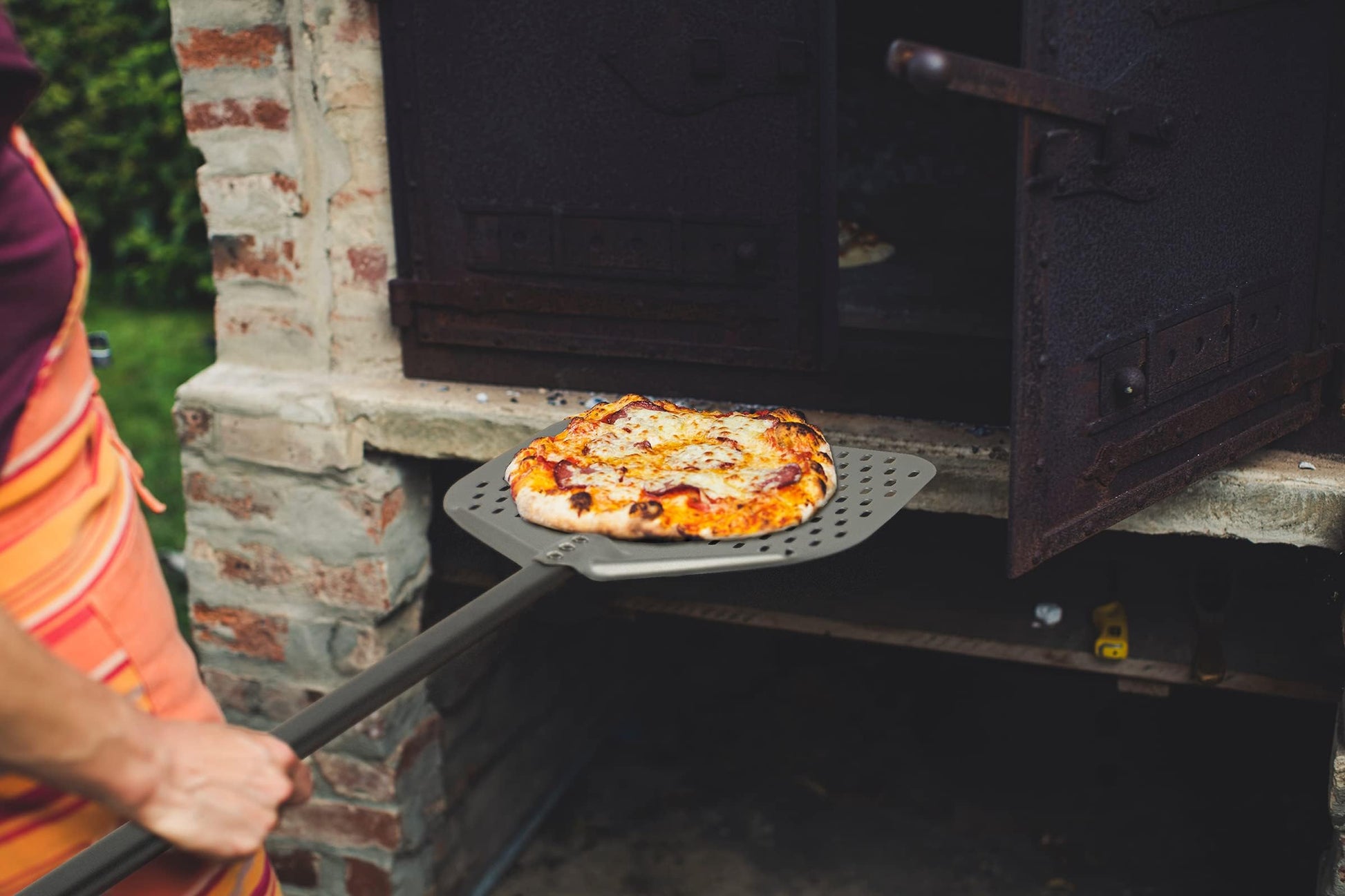 ["Great Kitchen Tool: This set of 3 pizza peels is an essential item for pizza lovers, home bakers, and professionals. The set includes a 12-inch x 14-inch rectangular aluminum pizza peel, a 9-inch round aluminum pizza peel, and a pizza brush with bristles.","ANODIZED ALUMINUM: The perforated pizza peel is equipped with a hard anodized aluminum head that protects its surface from oxidation. Not only resistant to high temperatures, but also to wear and corrosion.","12 Inch PIZZA PEEL: The large blade measures 39 x 30 cm. Along with the slightly angled edge, it makes it easier to slide the pizza in and out of the oven. Easily slips under pizza, Stromboli pizza, bread, and sandwiches.","8 inch TURNING PIZZA PEEL: The blade is 9 inches, with a handle length of 93 cm. The round pizza peel is used for maneuvering and turning your pizza in the hot oven to ensure that your pizza cooks perfectly every time without burning.","Pizza Brush: The oven pizza brush features an aluminum handle, sturdy brass bristles to keep your pizza oven clean after use. The long handle is ideal for reaching deep into the pizza oven for cleaning."]