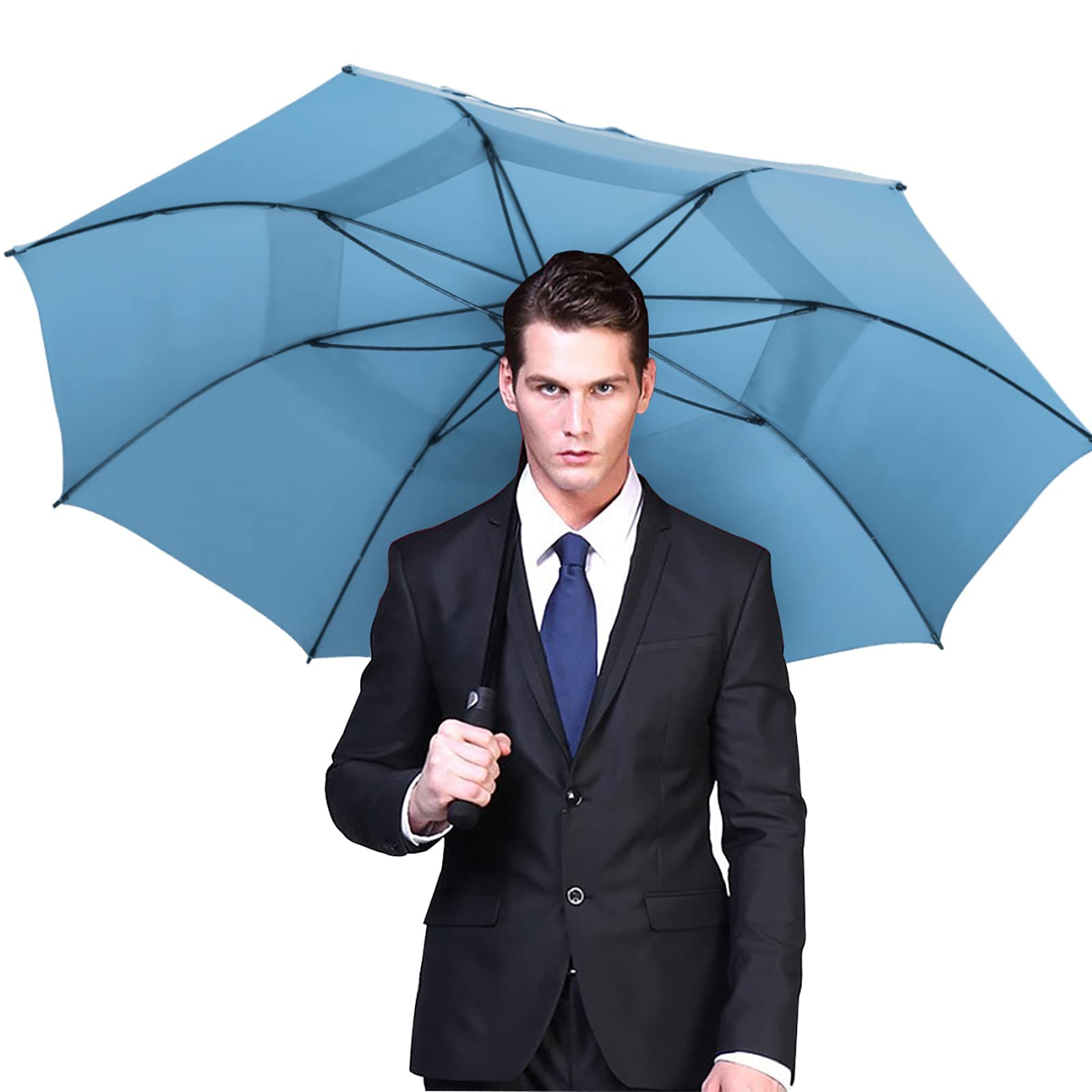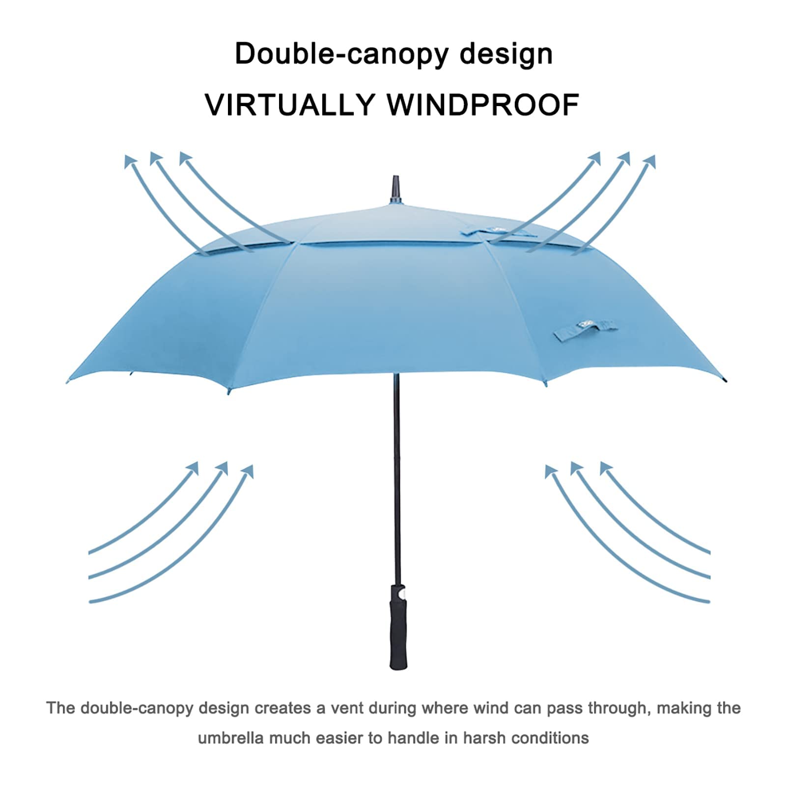 STRONG AND WINDPROOF: The double canopy design and fiberglass frame make your umbrella almost windproof. The double canopy design creates ventilation for the wind to pass through, and the fiberglass makes the umbrella very strong, making it easier to maneuver under harsh conditions.