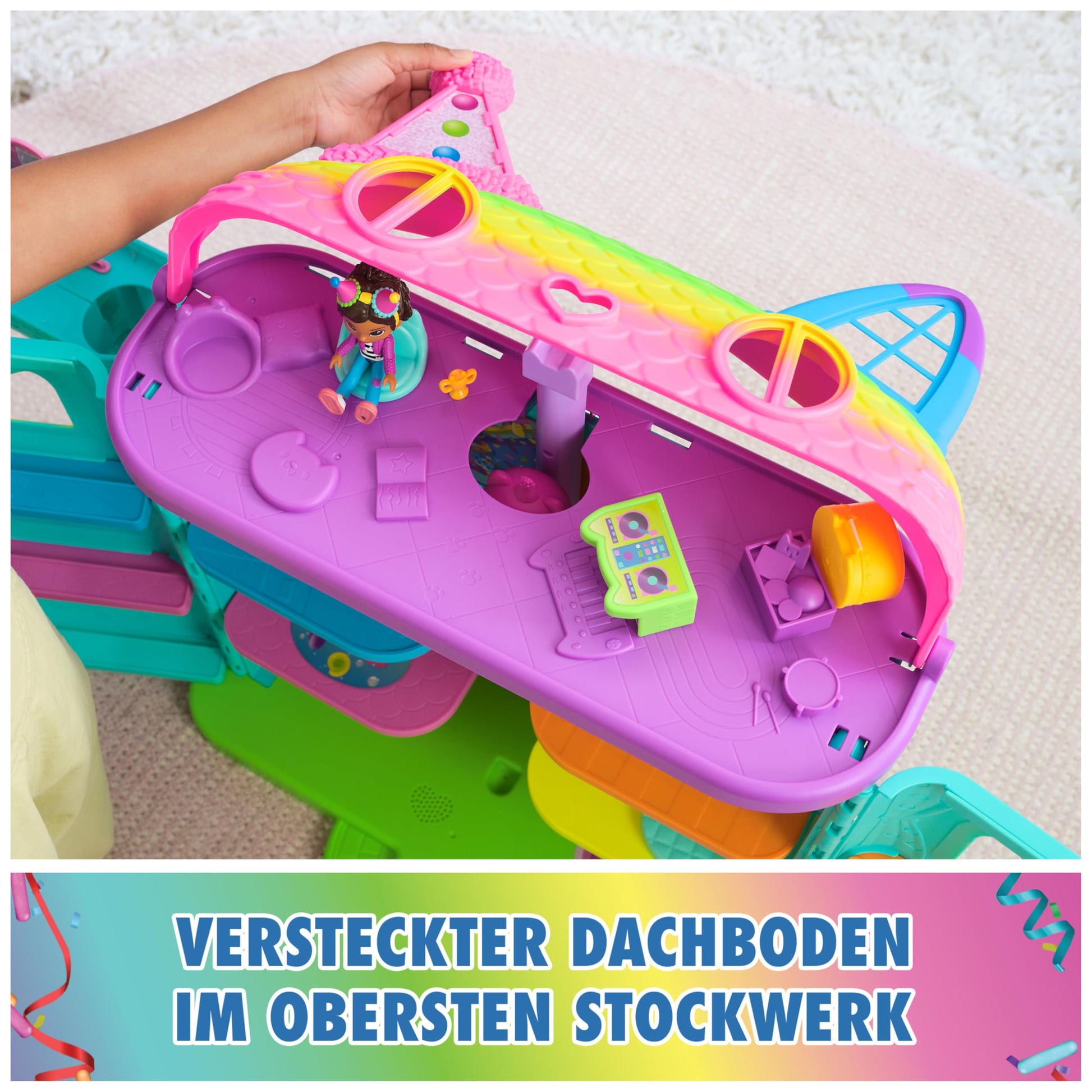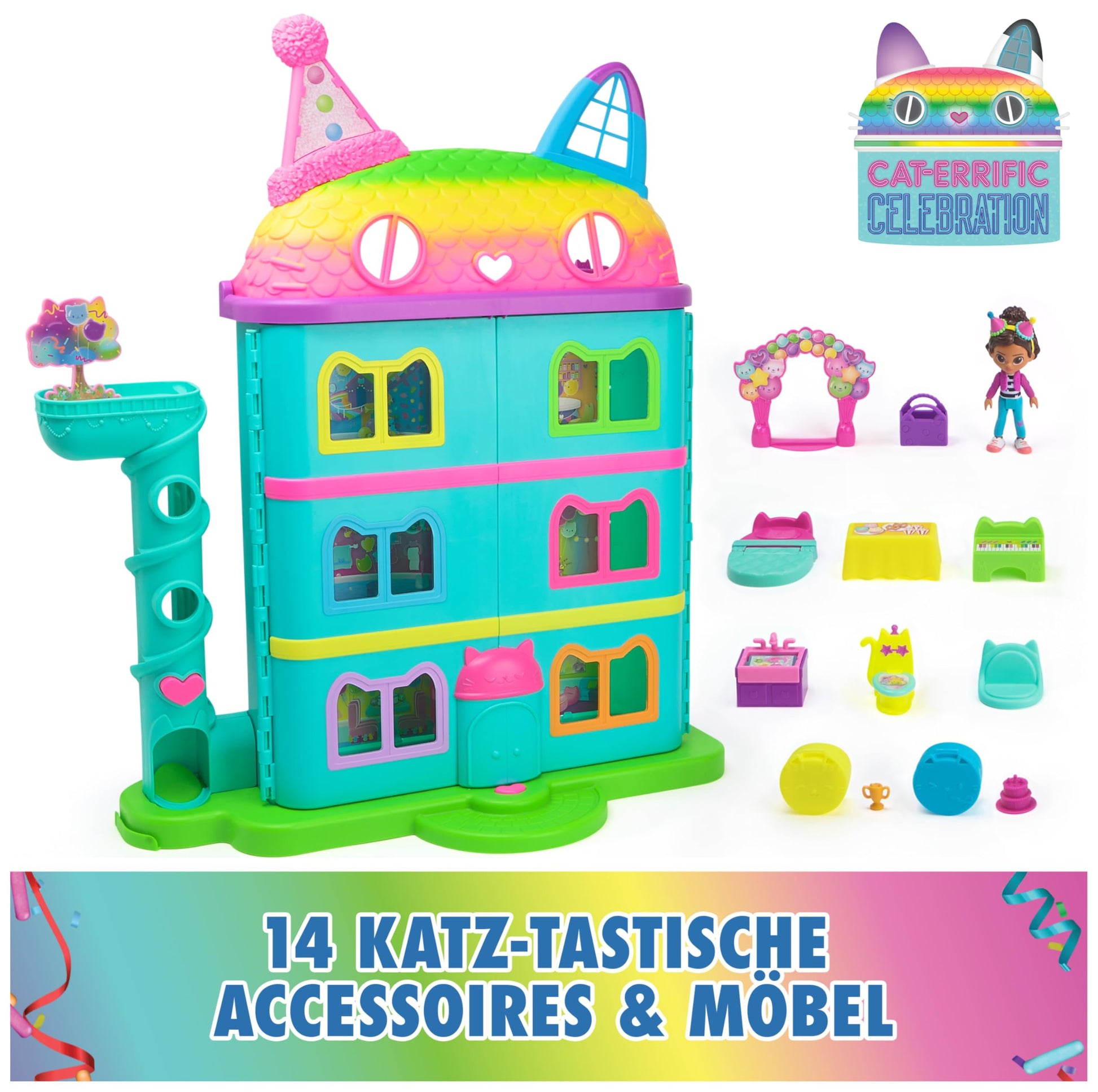 Gabby's Dollhouse, 15-piece Purrfect Party dollhouse play set in rainbow colors, over 60cm with Gabby figure, furniture, and sound effects, for ages 3+.