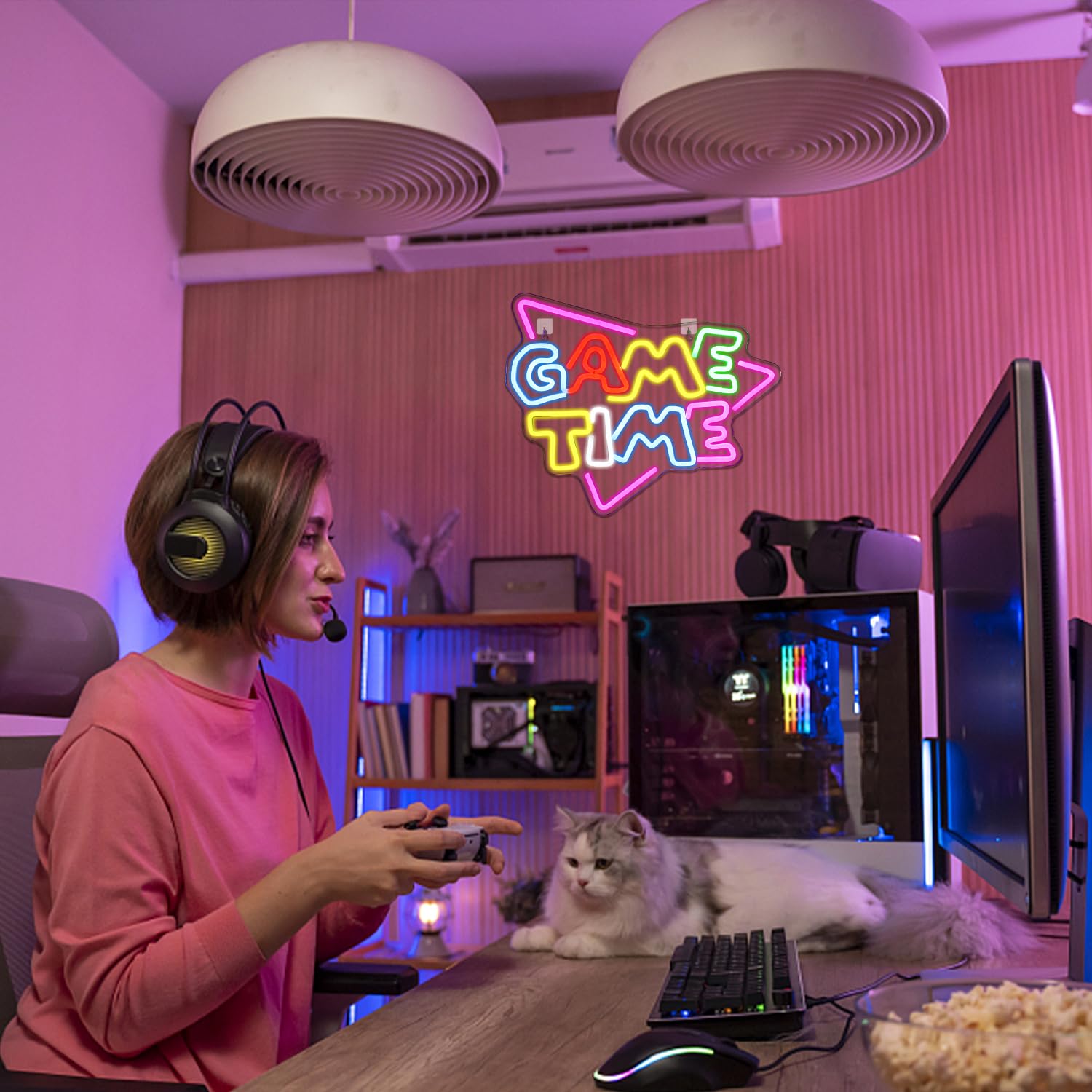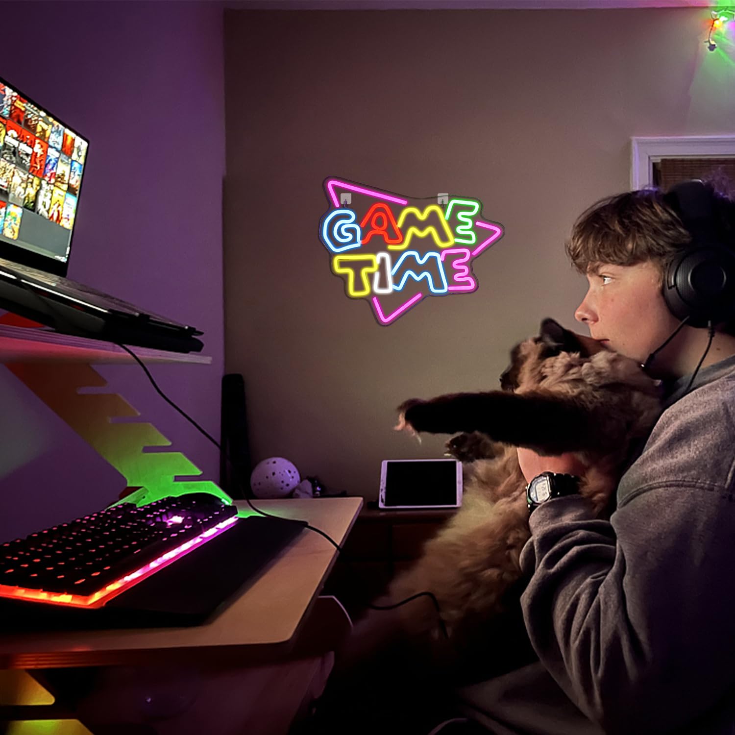 ["Personalized neon sign: Game time neon sign is a great addition to your game room for conversations and gaming enthusiasts. Designers have gone through hundreds of toning and matching to create this brightly illuminated, colorful game time neon. Turn on the neon light for the gaming table to give your space a gaming ambiance and make a dull room fun.","Easy to use: Colorful neon light 12.6\" x 15.3\" / 32cm x 39cm, it is very convenient to connect to an adapter, power bank, or computer to charge. The cable is 74.8\" / 190cm long and serves as both a neon desk lamp and wall mount. The acrylic back plate has two reserved hook holes that are easy to hang.","Safety & Energy Efficient: 5v low voltage design, higher brightness, lower energy consumption, very suitable for commercial use. The night light uses flexible silicone LED strips that have a long lifespan and there is no risk of normal neon glass breaking or harmful substances leaking out.","Wide Range of Applications: Game time neon lights are perfect for use in the transparent windows of bars, game rooms, themed hotels, shops, e-sports clubs. The neon sign is exquisite and attractive, making it an excellent gift for children and friends.","100% Service: We check every package before sending the neon sign to ensure there is no problem with each wall neon sign package. If you have any questions about the neon sign, please contact us as soon as possible, we will solve the problem for you within 24 hours."]