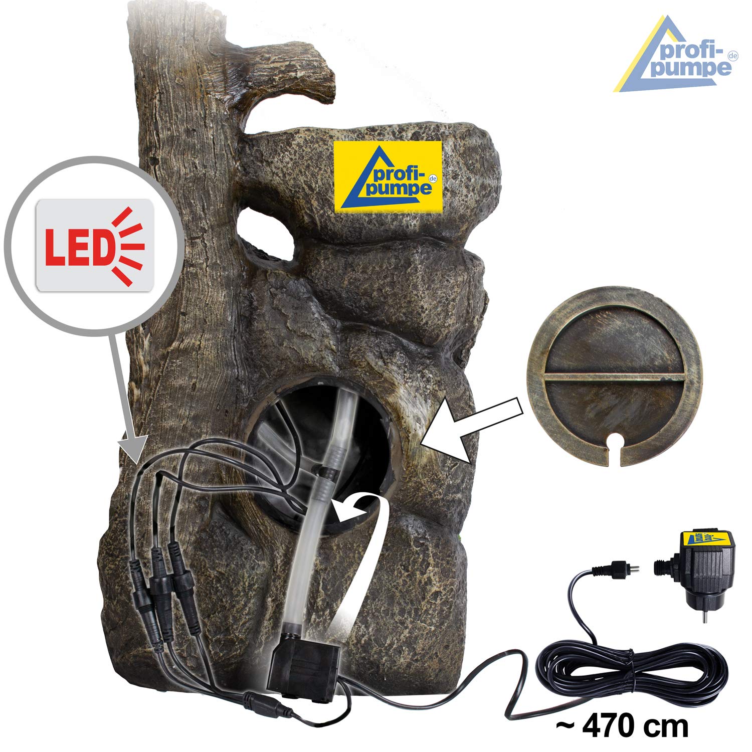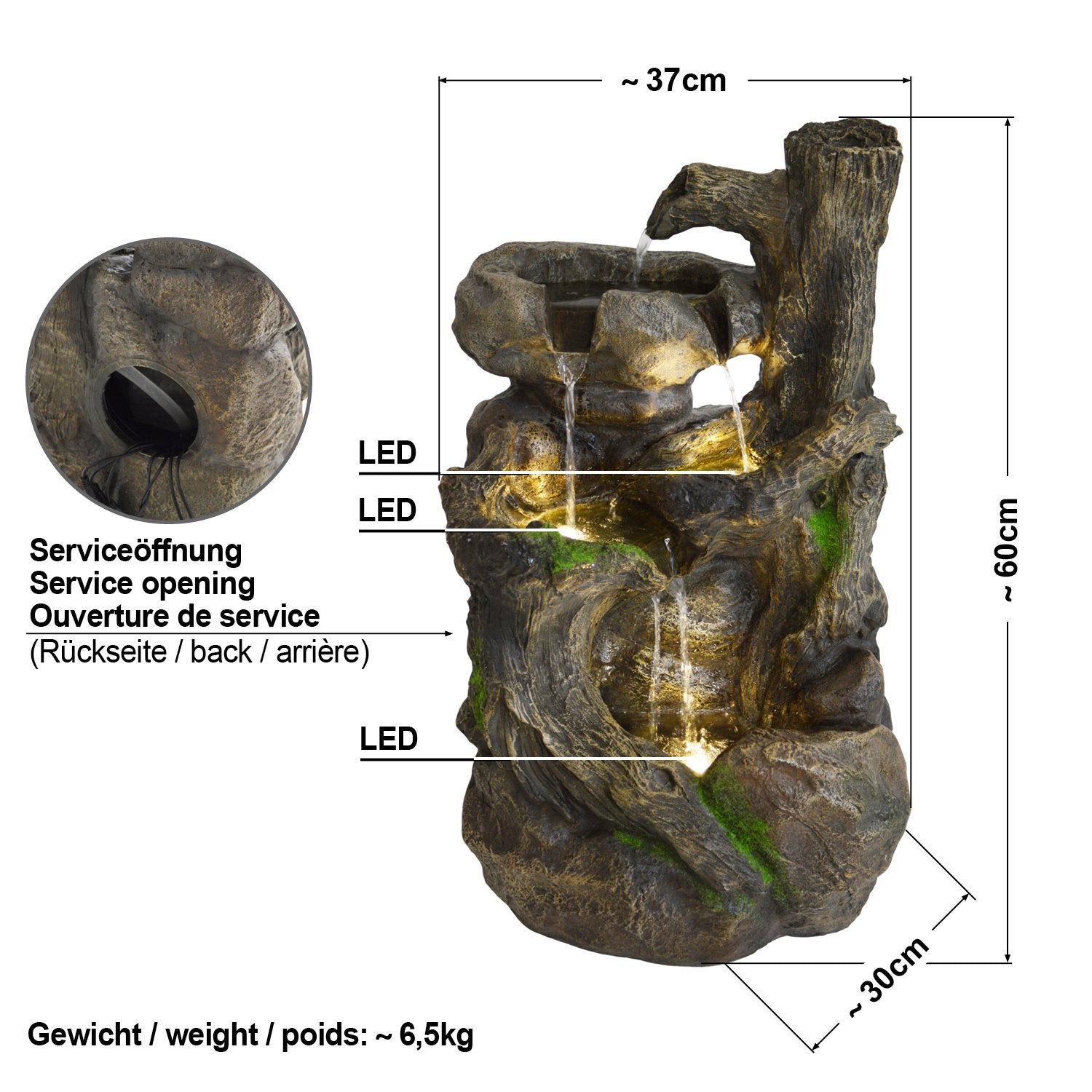 ["⭐⭐⭐⭐⭐ GARTENBRUNNEN BRUNNEN \"BAUMWURZEL & STEIN-KASKADE with LED Light - Enhances any location: The life elixir water revitalizes living rooms, dining rooms, hallways and entrances, conservatories or balconies, terraces and gardens in private and commercial environments","⭐⭐⭐⭐⭐ Ready-to-use indoor and outdoor fountain | invigorates the senses | improves air quality | realistic tree root and stone bowl replica with lifelike moss decoration","⭐⭐⭐⭐⭐ With 230V/12V connection | Incl. 7 watt pump | Incl. LED lighting in warm white (replaceable) | Incl. Connection accessories: 5m pump cable, 0.6m LED cable, 12V adapter","⭐⭐⭐⭐⭐ The calming sound of the water adds a special touch to any environment. Flowing water not only has a positive effect on mood, but also provides a pleasant microclimate on hot summer days indoors and outdoors. In autumn and winter, the fountain with its flowing water creates optimal humidity in the rooms. So this water fountain is not only decorative, but also useful and health-promoting","⭐⭐⭐⭐⭐ DECORATIVE, USEFUL & HEALTH-PROMOTING: Flowing water not only has a positive effect on mood, but also provides a pleasant microclimate on hot summer days indoors and outdoors. In autumn and winter, the fountain with its flowing water creates optimal humidity in the rooms","⭐⭐⭐⭐⭐ Note: Frost can cause damage to the garden fountain and the pump. In case of frost danger, the garden fountain and the pump must be emptied, rinsed with clear water, and stored dry. Then you will enjoy it for a long time!"]
