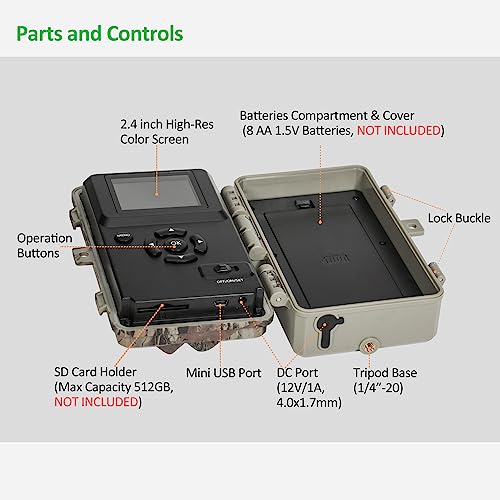 ["【Super Low-Light Sensitivity】 Sony Starvis image sensor, premium lens component with extremely large aperture, exclusive algorithm for automatic exposure and blur reduction provide colored images in low light and clear night vision in complete darkness. Max. 32MP still image. 30m night vision flash range.","【H.264 Video Recording】 Advanced H.264 1080P 30fps video recording with clear sound, playback clearer and smoother. Compared to MJPEG video used in other wildlife cameras, the compact file size saves 80% more storage space than traditional. The video is in MP4 format, which is better compatible with all players.","【Fast Motion Detection】 Pre-activated technology for 0.1s trigger speed, super fast 0.5s recovery time, 27m detection distance and 120° detection angle, allow you to capture every single movement, no matter how fast it is.","【Very Easy to Use】 TV remote style operating buttons, high resolution 2.31-inch color screen and intuitive programming for easy setup and playback. Accepts max. 512GB standard SD card (NOT included).","【Versatile Features】 Time-lapse, operating hours, loop recording, date info strip, long standby time up to 8 months, waterproof."]