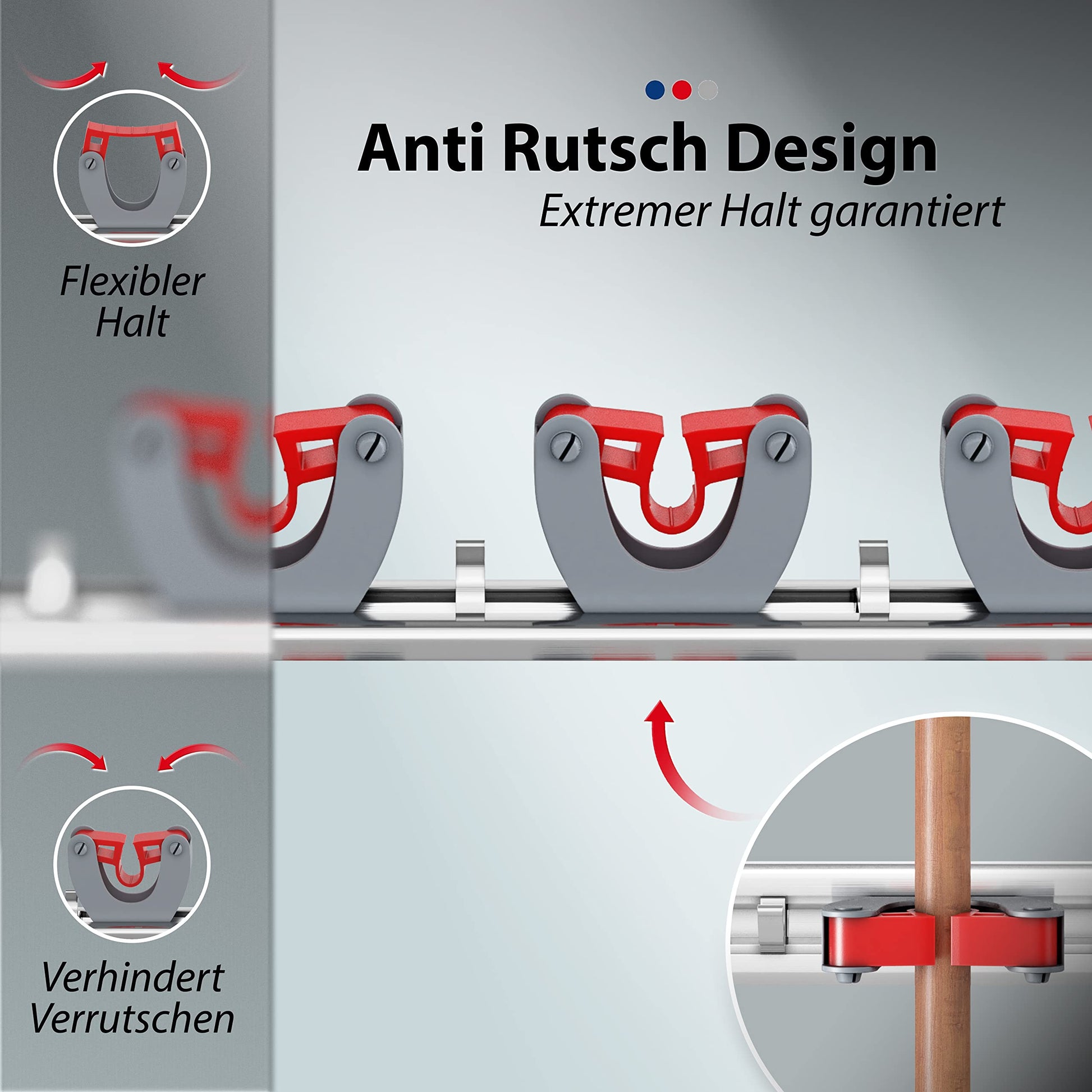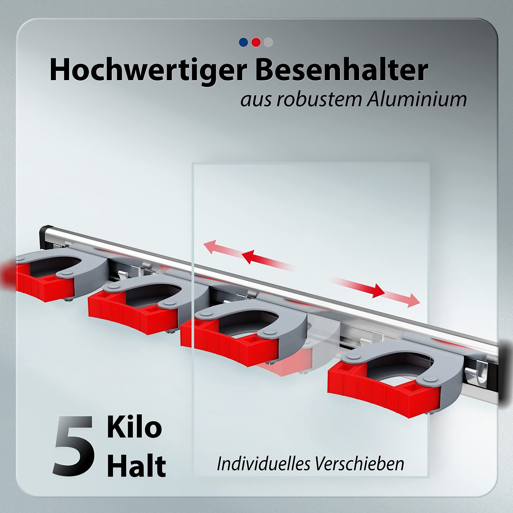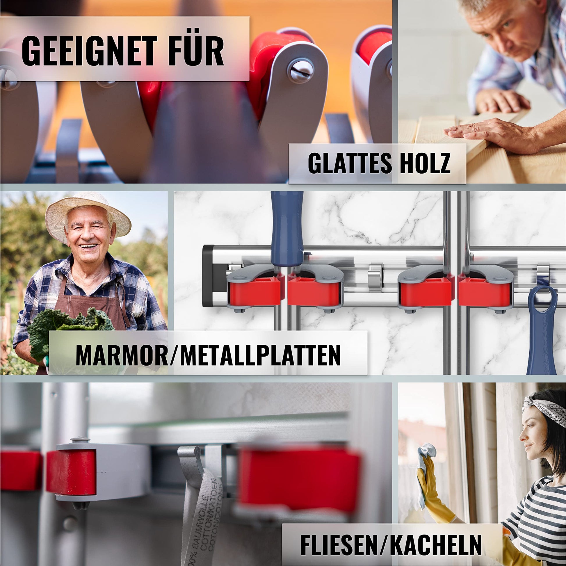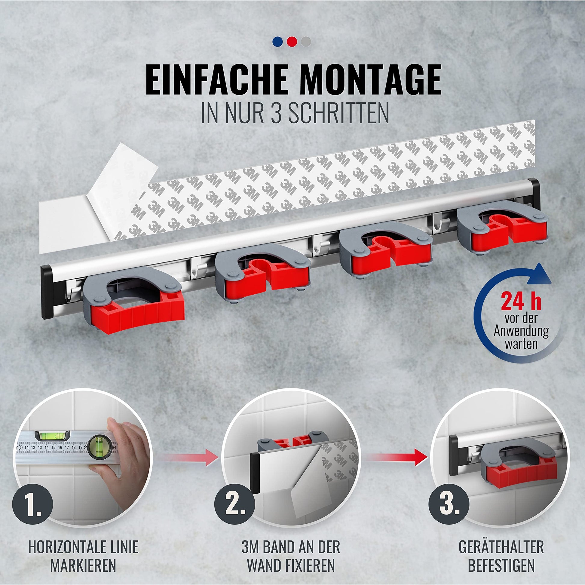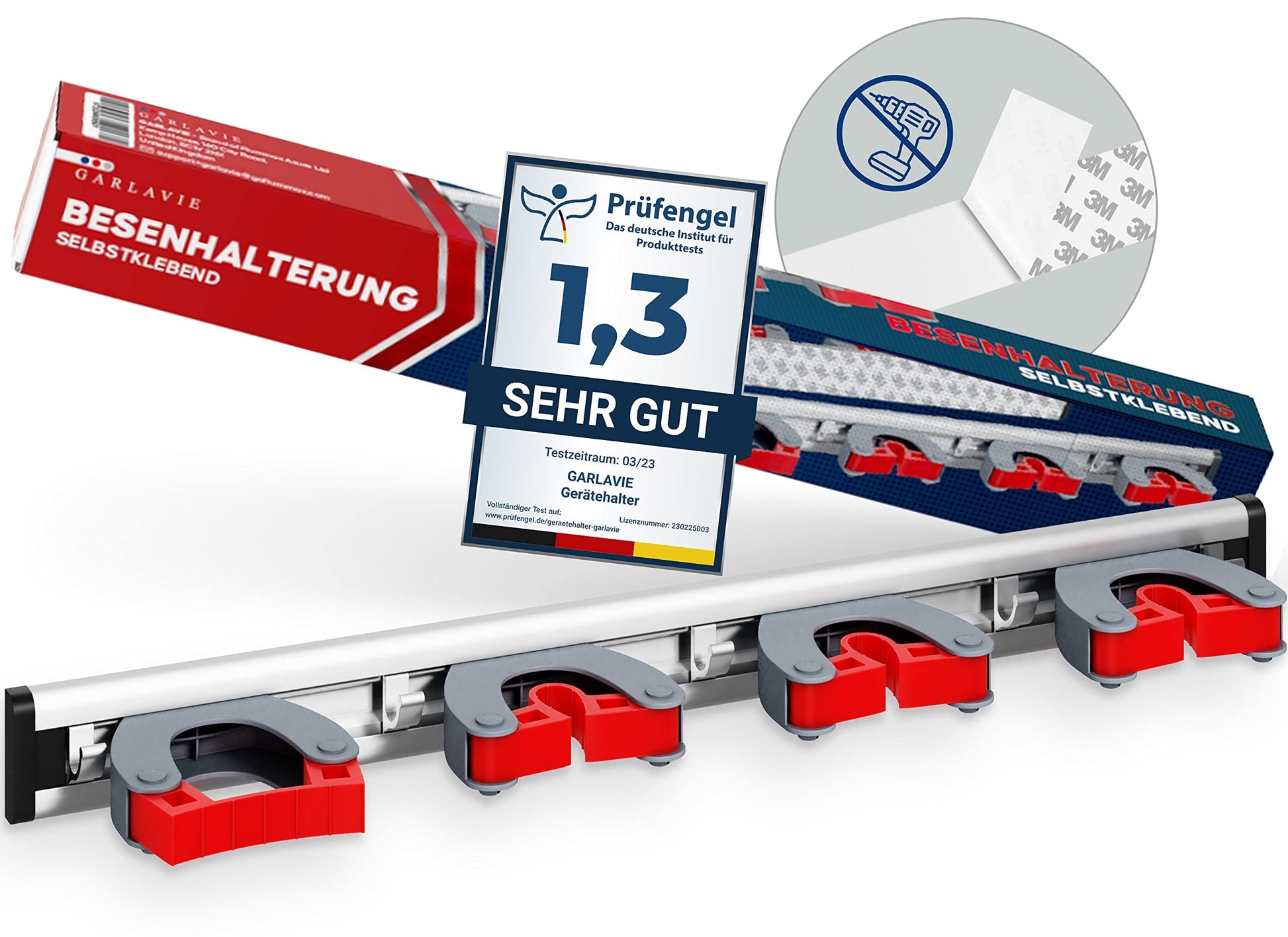 Garlavie self-adhesive broom holder for wall with 4 holders and 5 hooks - tool holder for brooms, garden tools, and kitchen - broom holder without drilling - organizer for garden and household 1x
