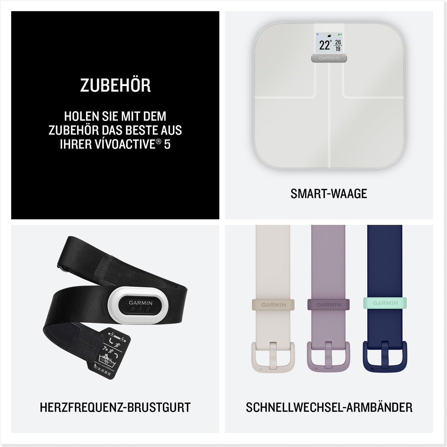 ["YOUR STYLE: The fitness smartwatch with a bright color display and a battery life of up to 11 days in smartwatch mode provides a more complete picture of your health.","YOUR HEALTH: Get to know your body better with a variety of health monitoring features, including wrist-based heart rate monitoring, morning reports, fitness age, stress level tracking, meditation, and more.","YOUR FITNESS: Discover new ways to move with over 30 integrated sports apps, including walking, running, cycling, HIIT, swimming, golf, and more. In wheelchair mode, pushes are recorded instead of steps.","YOUR WORKOUT: Utilize pre-installed workouts such as cardio, yoga, HIIT, and Pilates. Create your own workouts in the Garmin Connect smartphone app or try out the free, adaptive Garmin Coach training plans.","YOUR SAFETY: Safety and tracking features include incident detection and emergency assistance. Both features send messages with live location to designated emergency contacts when your smartwatch is paired with your smartphone.","SIMPLY SMART: Make and receive calls on your smartwatch; send messages with voice assistance; enjoy your favorite songs with Garmin Music; pay with Garmin Pay and receive notifications directly on your wrist.","GOOD OVERVIEW: Keep track of your health and fitness reliably with Garmin Connect, the only fitness app with a rating of 1.0 from Stiftung Warentest (07/23). With lots of information, graphics, and training – completely free"]
