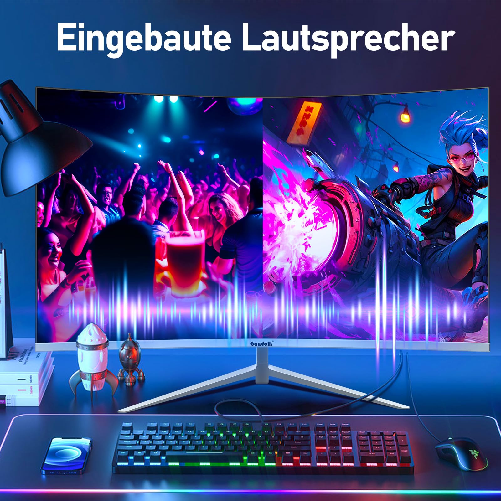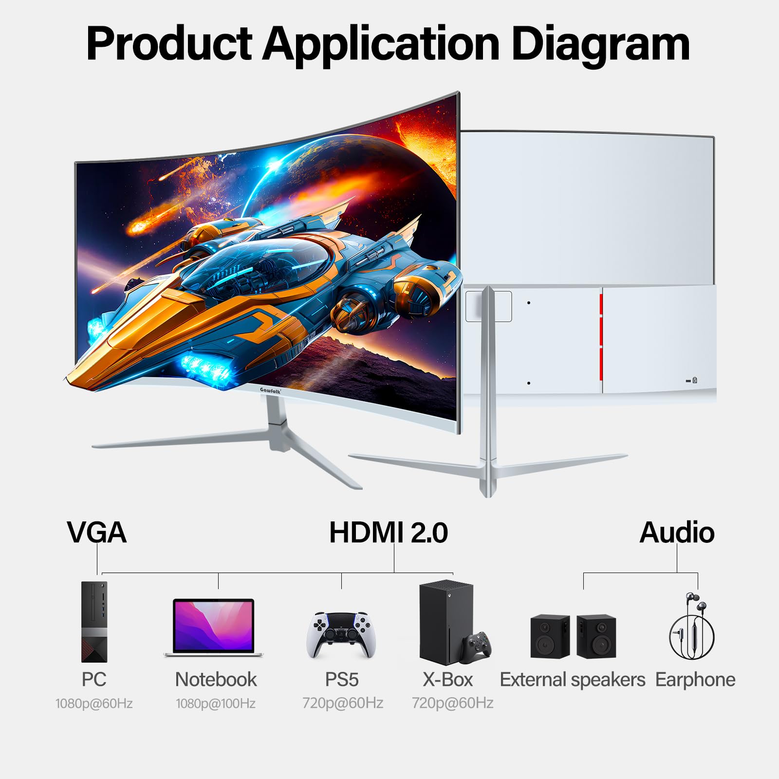 Gawfolk Curved Monitor 27 inch 100Hz with speakers, 1800R Curved PC screen FHD 1080P, White computer screen with Eye Care technology HDMI VGA, supports VESA.
