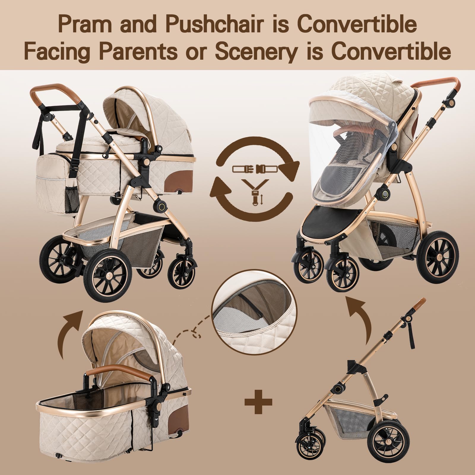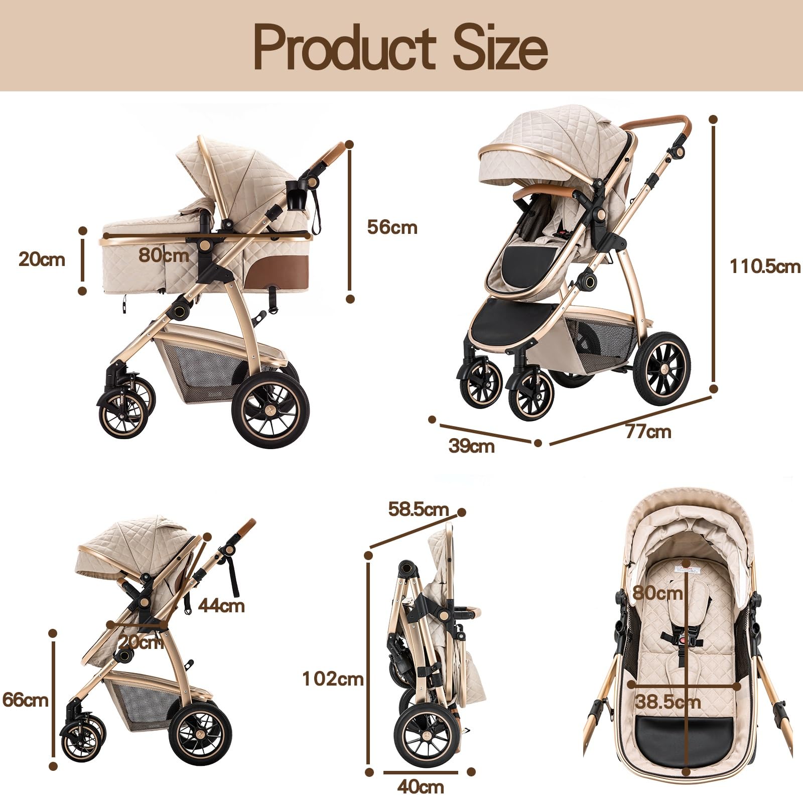 Gcarebb 3 in 1 stroller, buggy with car baby seat, with height-adjustable stroller set, combi stroller with aluminum frame for newborns 0-4 years.