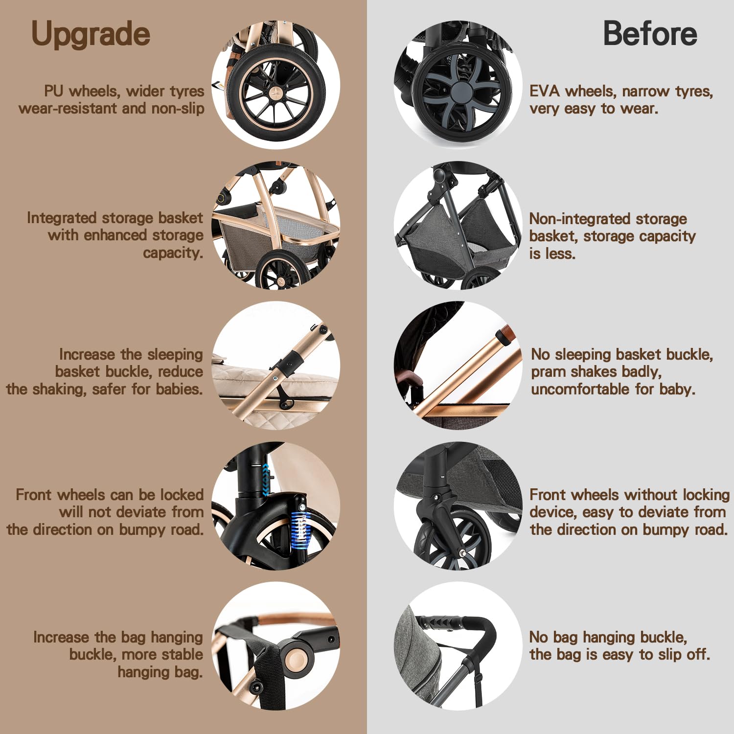 ["High-quality stroller EN1888-2 The stroller is suitable for infants aged 0-4 years weighing less than 22 kg and has successfully passed the European legislation EN1888-2 test. The sleep basket equipped with shock-absorbing carabiners significantly reduces shocks during transportation, making the stroller more comfortable. Also included is a detachable cover for cold weather, a mosquito net, a soft pillow, a large diaper bag.","Stroller and stroller 2-in-1 The baby carrier is suitable for 0-15 months and can be converted into a stroller suitable for 7-48 months. The seat can be installed in both directions. The stroller has an adjustable five-point harness. The backrest of the stroller has 3 adjustment modes: sitting position 135°, semi-recline mode 150°, lying position 180°. The handlebar can be opened with one hand and then rotated 180°, which is convenient for babies to get in and out.","Multifunctional car seat The car seat is suitable for babies from 0 to 15 months and complies with European Regulation ECE R131. The car seat can be easily mounted on the stroller frame using the car seat click system. By adjusting the angle of the armrest, the car seat can be transported to prevent the baby from waking up. The car seat can be used as a cradle when placed on a flat surface to gently rock your baby.","Stroller with height-adjustable handle and suitable for winter and summer The height of the stroller can be adjusted so that people of all sizes can comfortably push the stroller. The top and side ventilation openings can be opened or closed depending on the climate. The warm footmuff can be removed and replaced with a mosquito net in summer. The canopy has 4 speeds that can be adjusted according to sunlight.","Equipped with lockable front wheels, 4-wheel shock absorbers, and an aluminum alloy frame The front wheels of the stroller can be locked to prevent the stroller from losing control on bumpy roads. The wheels are equipped with independent shock absorbers to effectively absorb external impacts. The aluminum frame, 66 cm from the ground, is not only lightweight but also keeps the baby away from exhaust pollution."]