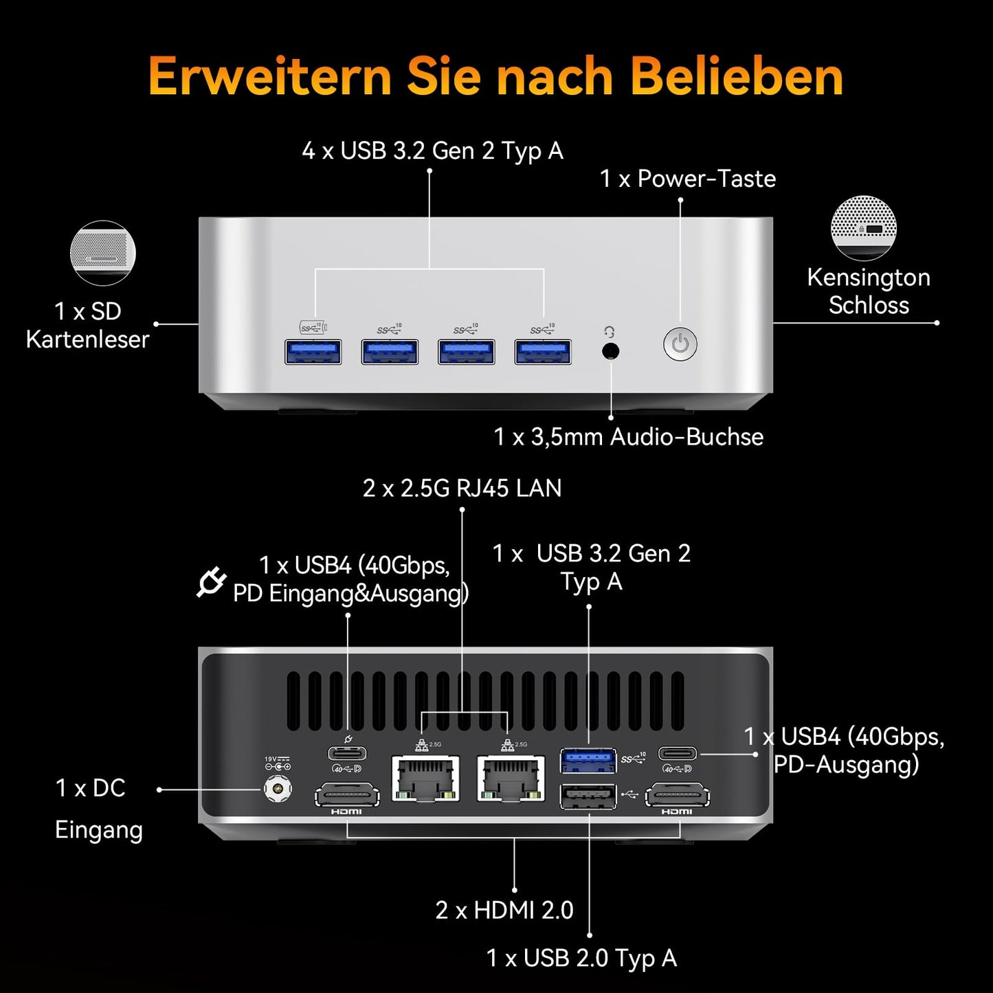 "Multiple Connectivity Options and Excellent Data Transfer: Compared to the A8, the A8 Max Mini PC offers up to 5 USB 3.2 Gen 2 ports, 1 USB 2.0 port, 2 Type-C ports, 2 HDMI ports, and 1 SD card slot. This design allows for the connection of numerous peripheral devices. For high-speed data transfer, connecting a graphics card, up to 8K video output, or power input, dual USB 4.0 ports are available!"