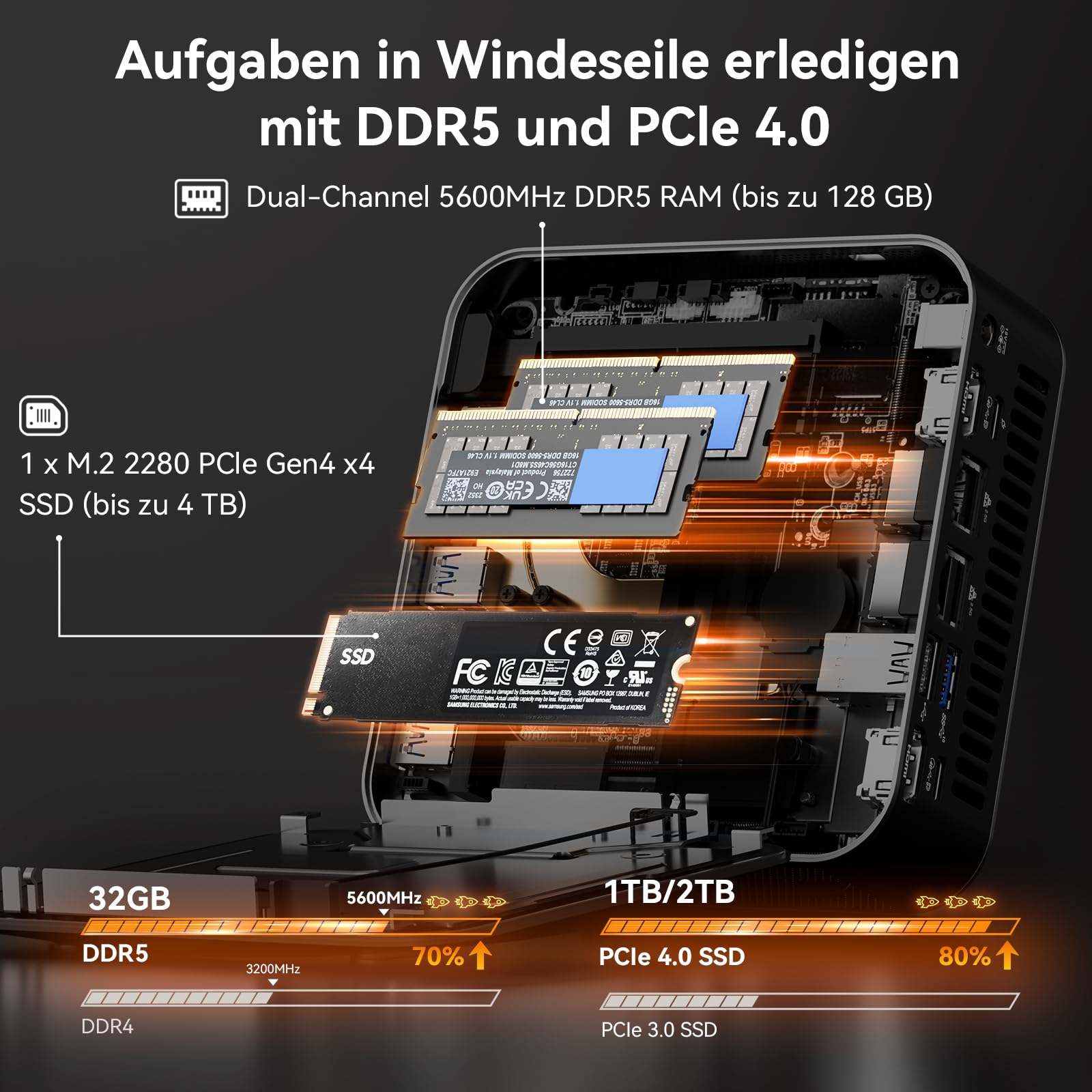 "Super fast RAM & Abundant Storage: The mini-PC has 32 GB of RAM and supports dual-channel DDR5 5600MT/s SODIMM memory expansion up to 128 GB for smooth multitasking. In terms of storage, it comes with a 2 TB M.2 2280 PCIe SSD (up to 4 TB) and is backward compatible with Gen3 SSD, supporting fast data read and write speeds."