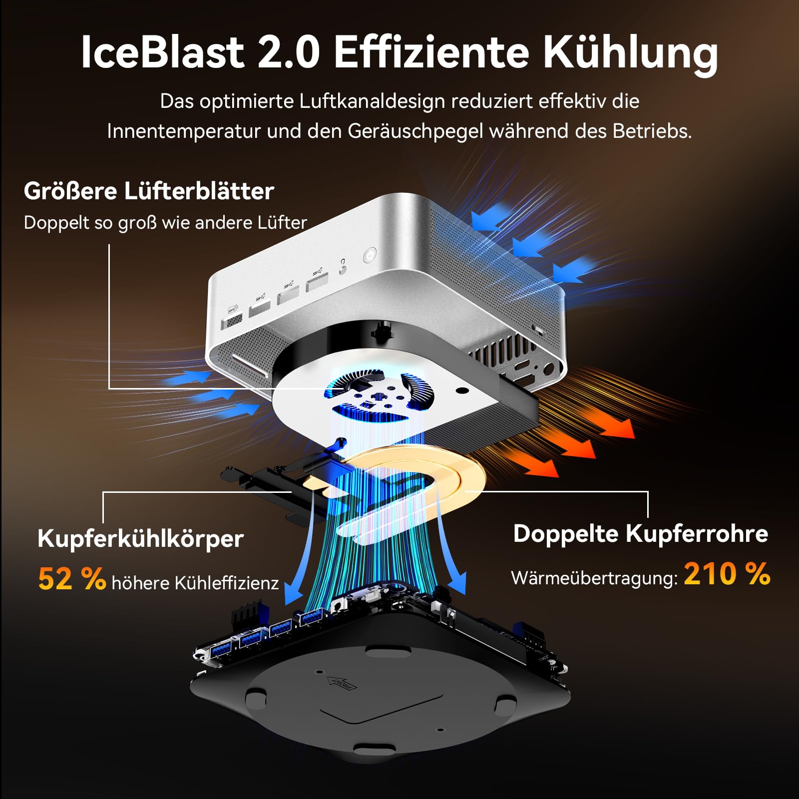 "Enhanced Cooling System for More Efficient and Quieter Operation: The GEEKOM A8 Max Mini PC comes equipped with the IceFlow 2.0 cooling system. GEEKOM's unique cooling design includes enlarged fans, copper heat dissipation modules, large heat pipes, and a separate copper plate covering the CPU power supply for heat dissipation. This advanced cooling technology not only ensures quiet and efficient operation but also significantly reduces power consumption."