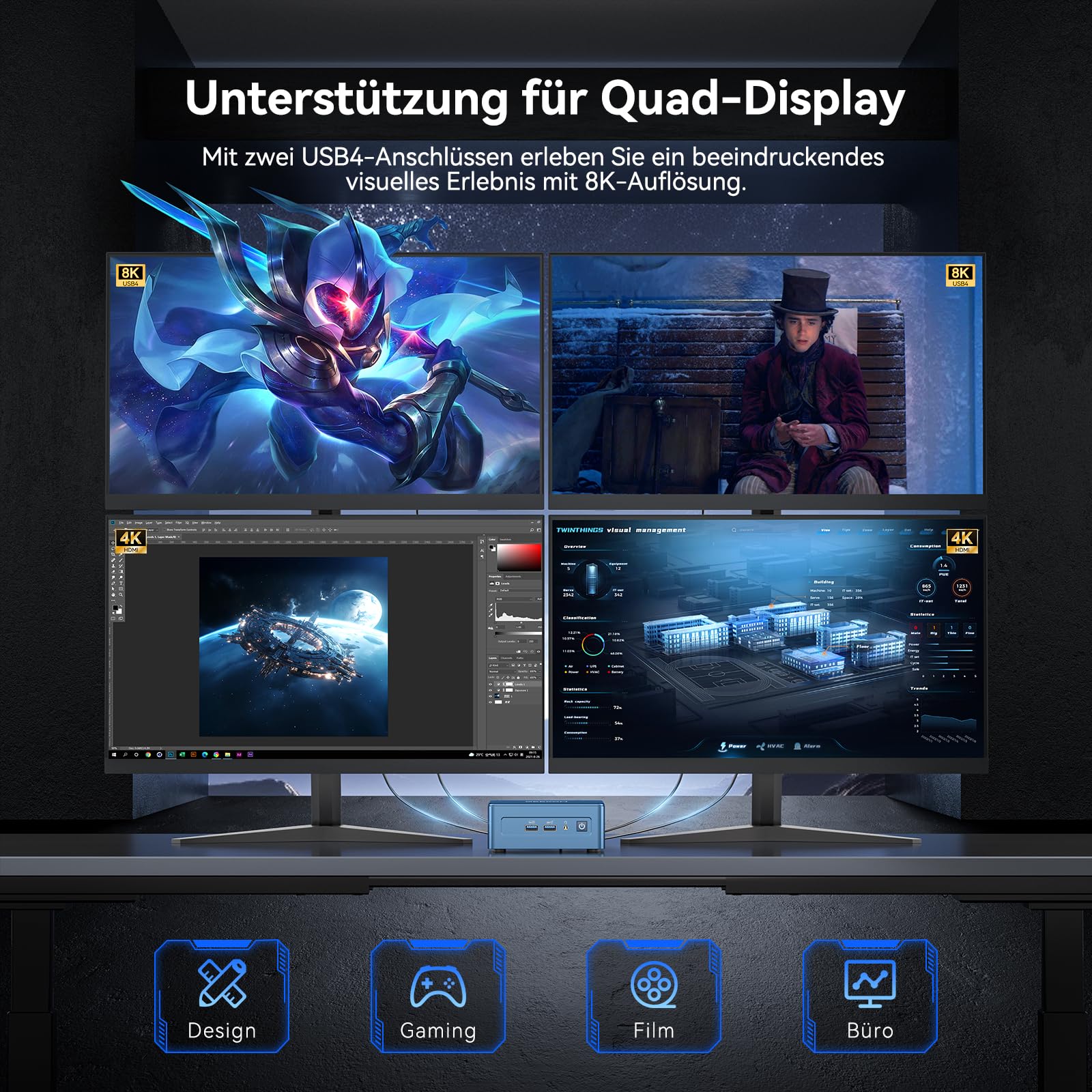 Quad-Display Support - Powered by Intel UHD Graphics, this mini desktop pc supports over 2× HDMI 2.0 and 2× USB4 (more stable than Oculink), allowing the system to support up to four 4K@120Hz monitors or two 8K@60Hz displays for efficient work.