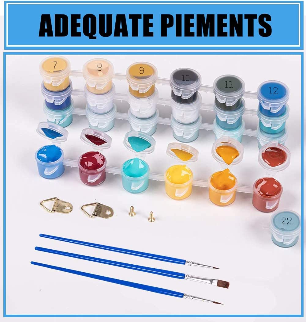 ["☀[About Oil Painting] painting by numbers, This is a hand-painted product that is processed into lines and digital symbols through special processing. The painter only needs to fill the numbered color area with the corresponding numbered color to complete the hand-painted product.","☀[DIY OIL PAINTING] Painting by Numbers, Painting by Numbers Adults Kids Beginners, Paint by Numbers, This number painting set is not finished, you have to paint it yourself to feel like a painter.","☀[EASY TO PAINT] Painting by Numbers suits all skill levels, DIY Painting by Numbers for Adults, follow the instructions, paint by color numbers, finish one by one.","☀[FREE STYLE] You can decide the drawing round according to your personal preferences or in rounds of numbers. Paint in your own style.","☀[Enhance Relationship] Share the DIY acrylic painting with your family or friends. Doing something creative together helps connect people. It can help improve the relationship between parents and children, husband and wife, girlfriend and boyfriend when painted together."]