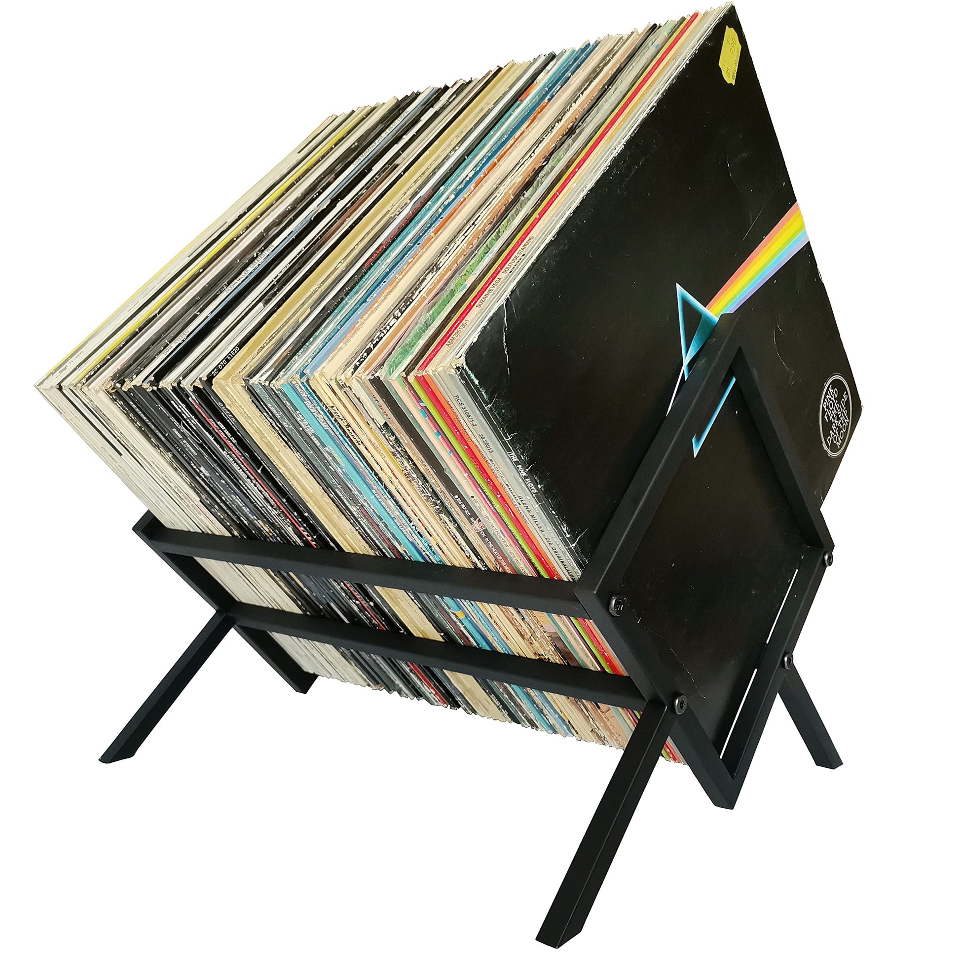 This modern record stand can hold up to 80 records or record boxes. The divider allows for easy storage of a smaller number of records. The records are placed at an angle in the stand, providing two surfaces within the sleeve for optimal record storage. It is a great addition to any large or small record collection as a stand for your favorite vinyl records. With its industrial design, it looks great next to any record player and complements your audio setup. It makes for a perfect gift for audiophiles.