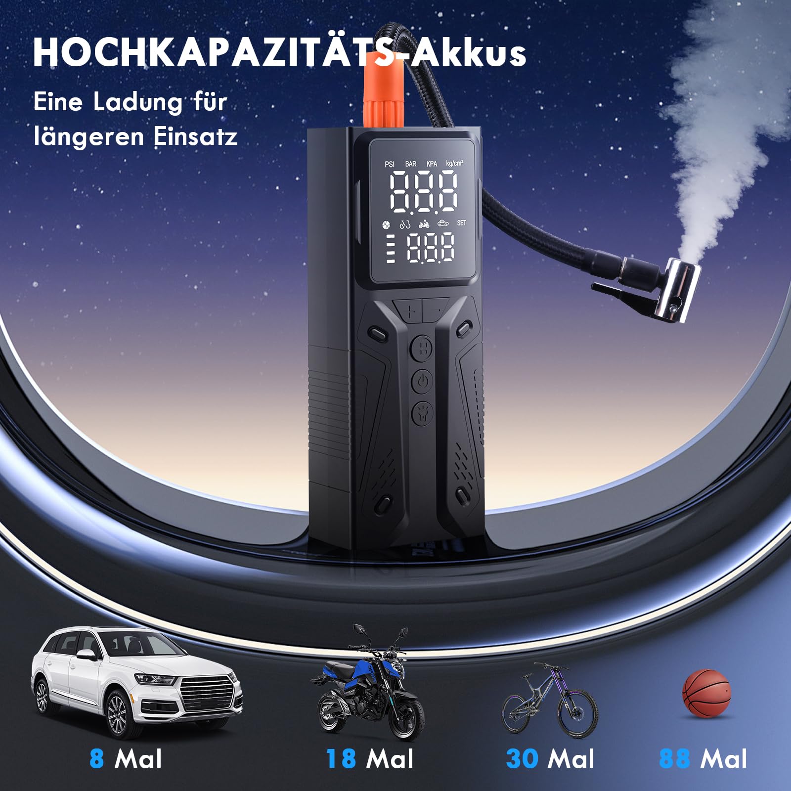 ["【3× Faster Inflation】Equipped with a high-performance motor and chip, this portable battery-powered air compressor provides a maximum pressure of 150 PSI. It can inflate a standard car tire from 30 to 36 PSI in less than a minute. Whether for emergencies or regular checks, you save valuable time on the go",