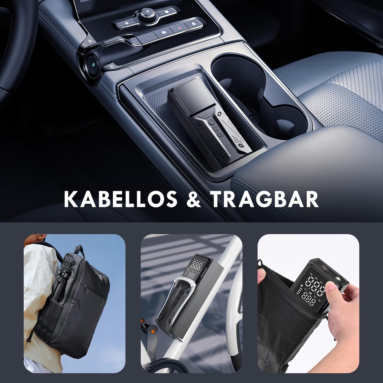 "【Wireless & Portable】Thanks to integrated rechargeable batteries, you can inflate tires anywhere without needing an external power source. The compact design and included storage bag make it easy to store the device in the car, on the bike rack, or in the backpack - ideal for travel and daily use",