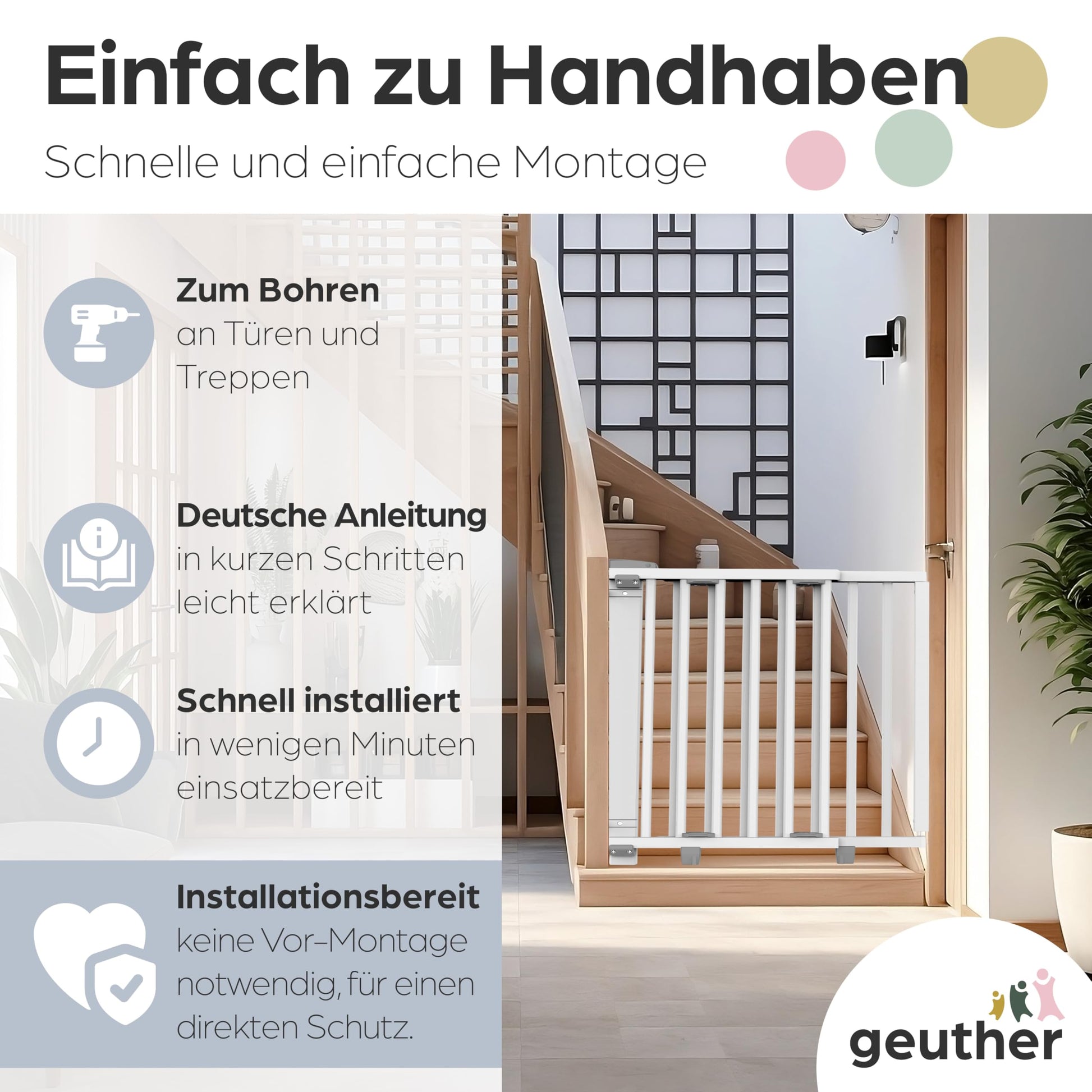 Geuther Door Safety Gate Oris | Staircase Safety Gate for screwing on, Width 86-133 cm | Sturdy Baby Gate & Door Gate with Swinging Door, Certified & Safety Tested | Wooden Child Gate, White