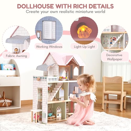 ["WOODEN DOLLHOUSE - The furnished "Giant Beans Dollhouse" playset is the perfect place for your dolls to live. This three-story house with muted colors is 31.5 inches tall and 23.6 inches wide, has 5 rooms, a working elevator, balcony, all-angle play, 22 accessories. Accommodates family dolls approximately 5 inches tall.","ELECTRONIC LIGHTS AND DOORBELL - Turn the lights on and off; Ring the doorbell, it buzzes. All details stimulate children's creativity and endless playfulness.","WORKING ELEVATOR - Elevator that can be moved up and down to each floor by manually turning the adjustable knob, lots of fun and play value.","REALISTIC SUNSHADE AND WINDOWS - Balcony with realistic sunshade roof for a relaxed atmosphere. This space is suitable for keeping pets, flowers or grilling. The wall-installed windows can be opened and closed like a real house bringing it to life.","QUALITY AND SAFETY FEATURES - Thanks to the sturdy wooden construction, the house can withstand frequent use and everyday play and will last for many years.","GREAT GIFT - A wooden dollhouse is the perfect gift for any special occasion and will surely be a popular toy for many years to come.","ASSEMBLY - Assembly took about 30-60 minutes. Follow the assembly instructions, first select the labeled parts and identify them to avoid rework."]