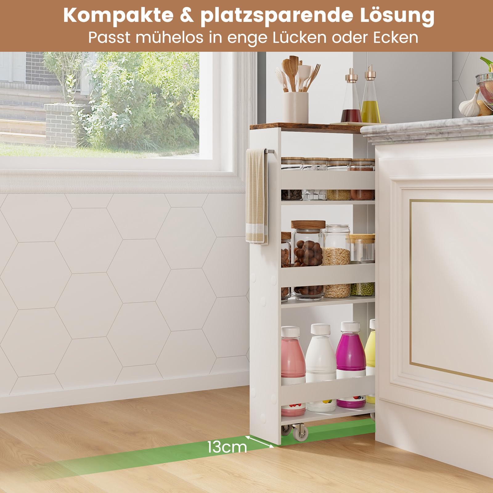 GIANTEX 13cm wide niche shelf, kitchen shelf kitchen cabinet kitchen trolley, niche cabinet niche trolley on wheels, bathroom shelf rolling cart wood 4 tiers, slim shelf for kitchen, 47.5 x 13 x 80.5 cm