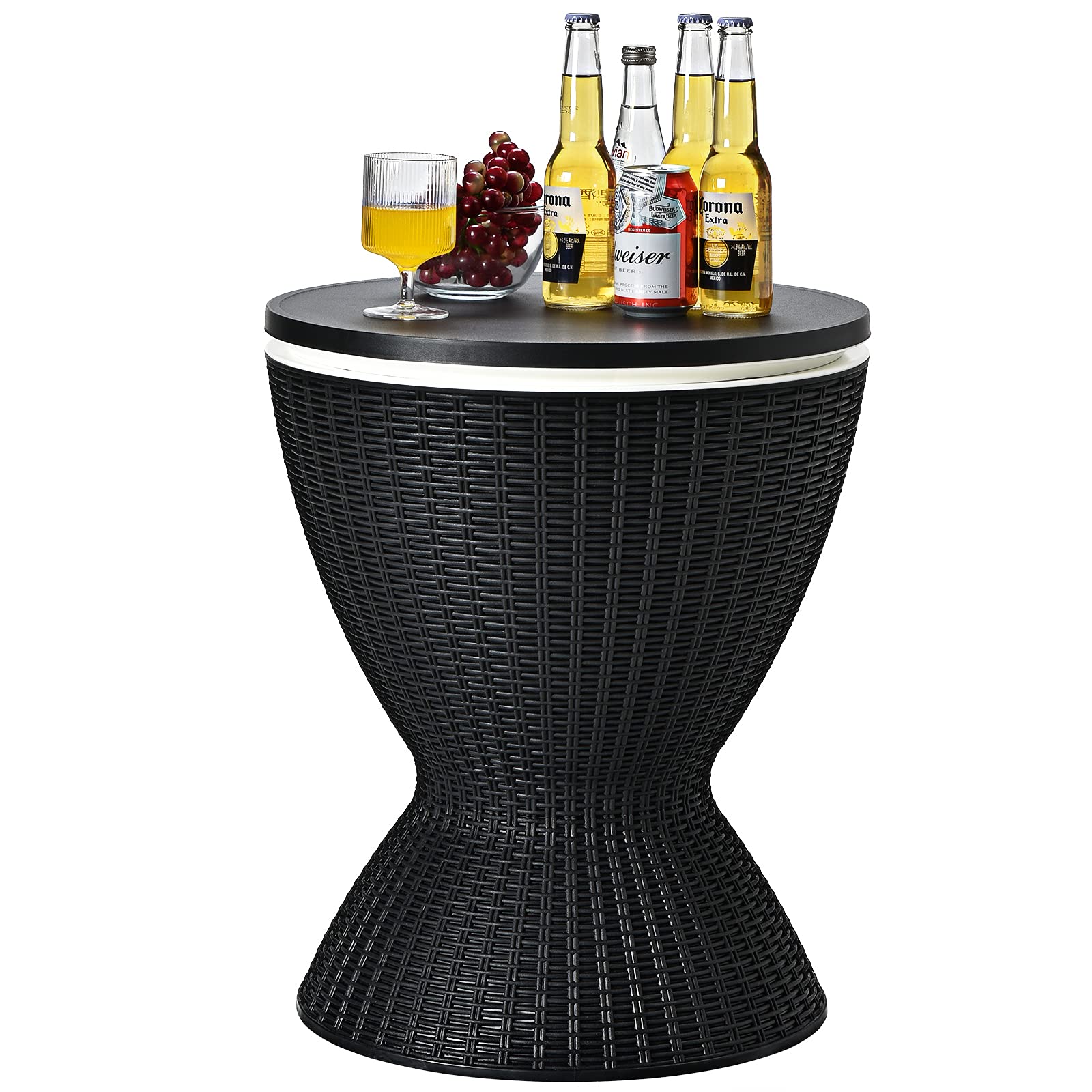 GIANTEX Cooler/ Side Table made of polyrattan, 30 L capacity Cool Stool in rattan look, cooler with lid & drainage hole, adjustable height garden table (Black)
