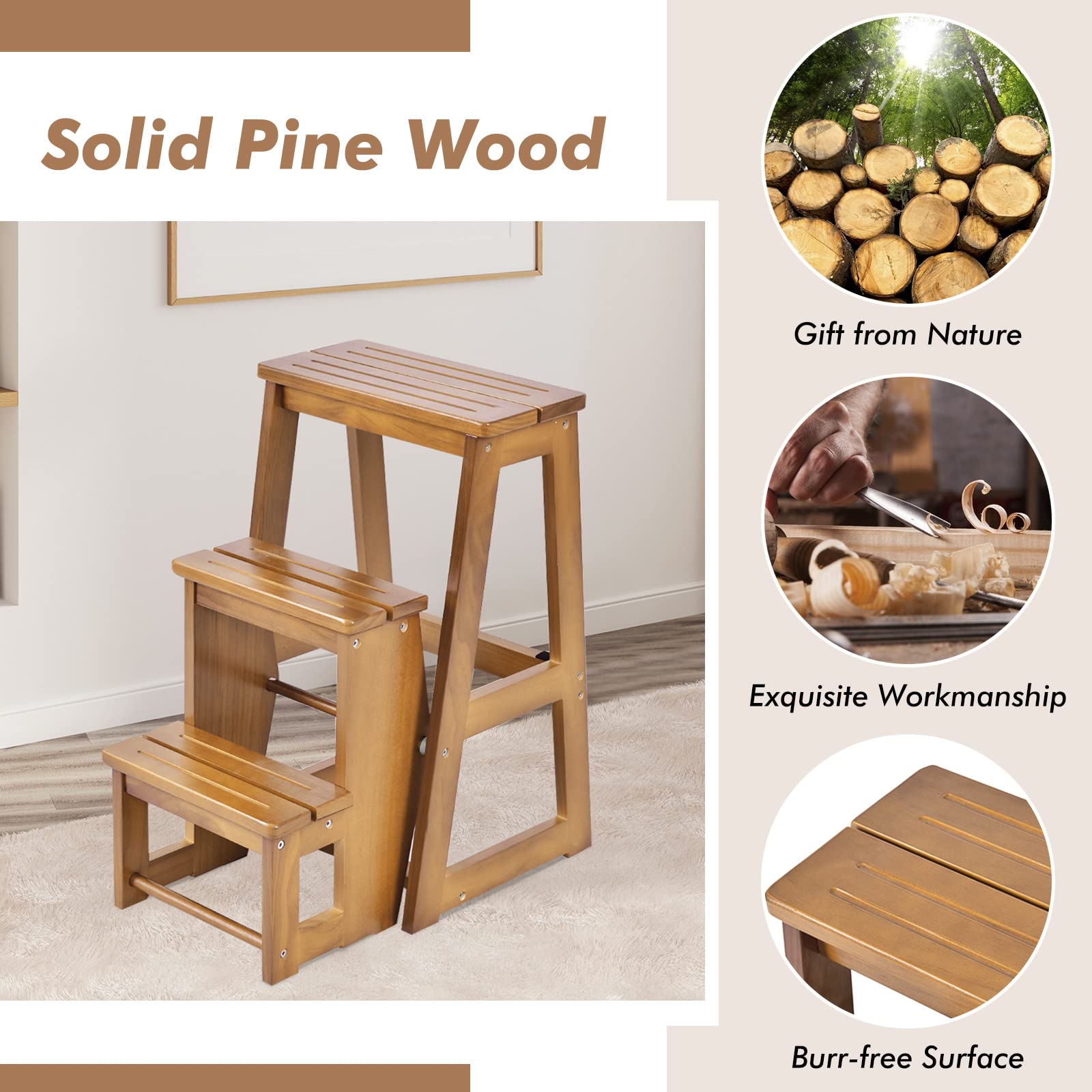 GIANTEX Wooden Step Stool 3 Steps, Folding Step Ladder Foldable Step Stool, Wooden Step Ladder Foldable, Household Step Small, Pine Wood Folding Steps (Walnut)