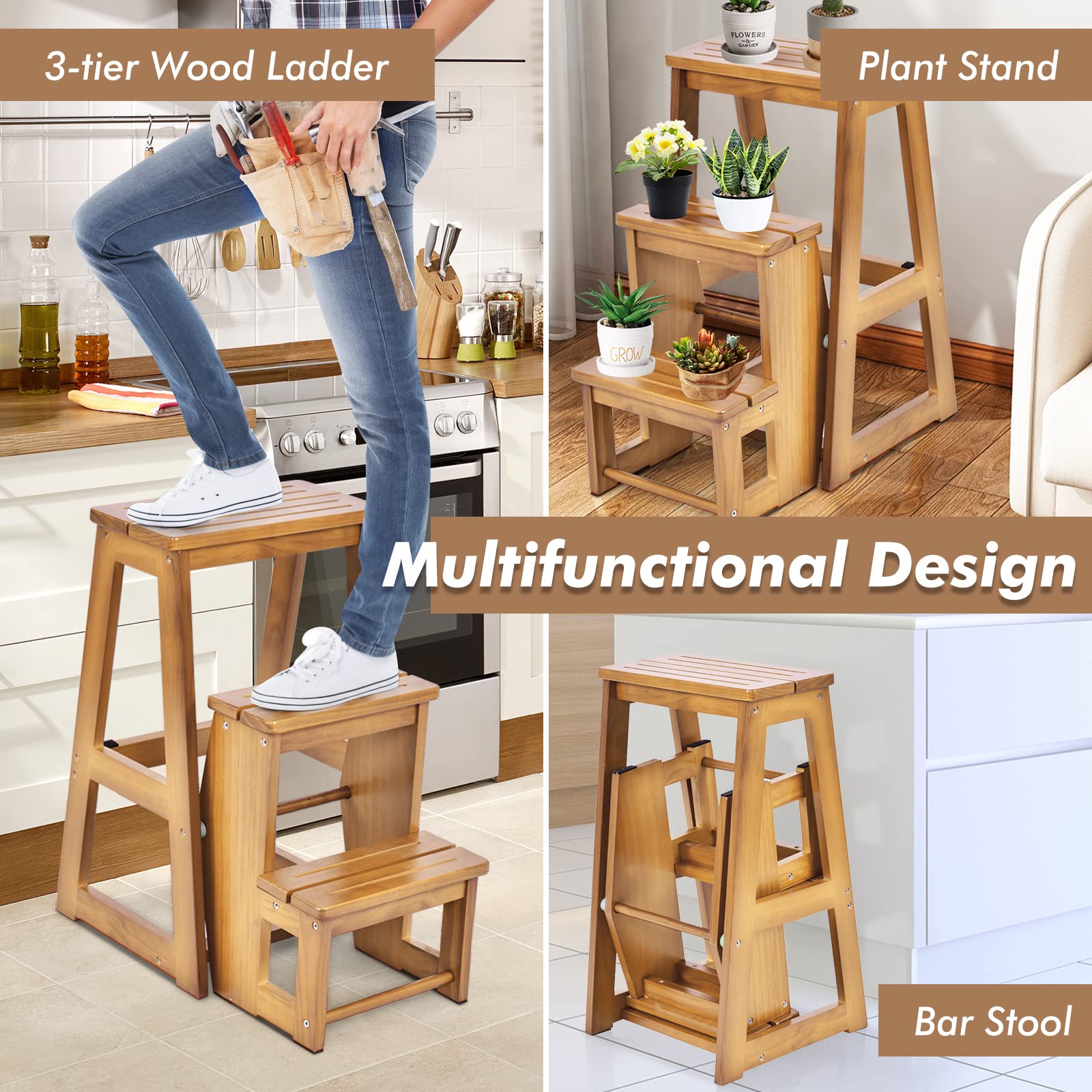 ["Classy Step Ladder 3 Steps - Our step stool has 3 steps each with a height of 8.7 inches, 17.3 inches, and 26 inches from the ground, helping you easily reach objects at height. The step surface is 7.7 inches, 5.1 inches, and 5.1 inches wide from top to bottom, allowing for safe and worry-free stepping.","Practical Folding - Thanks to the swivel mechanism, the bottom 2 steps can be conveniently folded underneath the 1st step when not in use. With the right height and sturdy construction, this step ladder can also serve as a spare seat for guests.","High-Quality Material - This ladder chair is made of solid pine wood, ensuring stability, wear resistance, and long-lasting durability. The surface coating extends the ladder's lifespan effectively. The wooden ladder can easily support a weight of up to 286 pounds and the seat can hold up to 330 pounds.","Versatile Use - In addition to its function as a stool, this wooden ladder is also great for displaying potted plants or other small items. Whether in the kitchen, living room, or on the balcony or patio, this folding step ladder will find its place.","Additional User-Friendly Features - Each support base has non-slip spacers, and each step surface has friction-enhancing indentations. The anti-slip pads under the feet prevent slipping and scratching on the floor."]