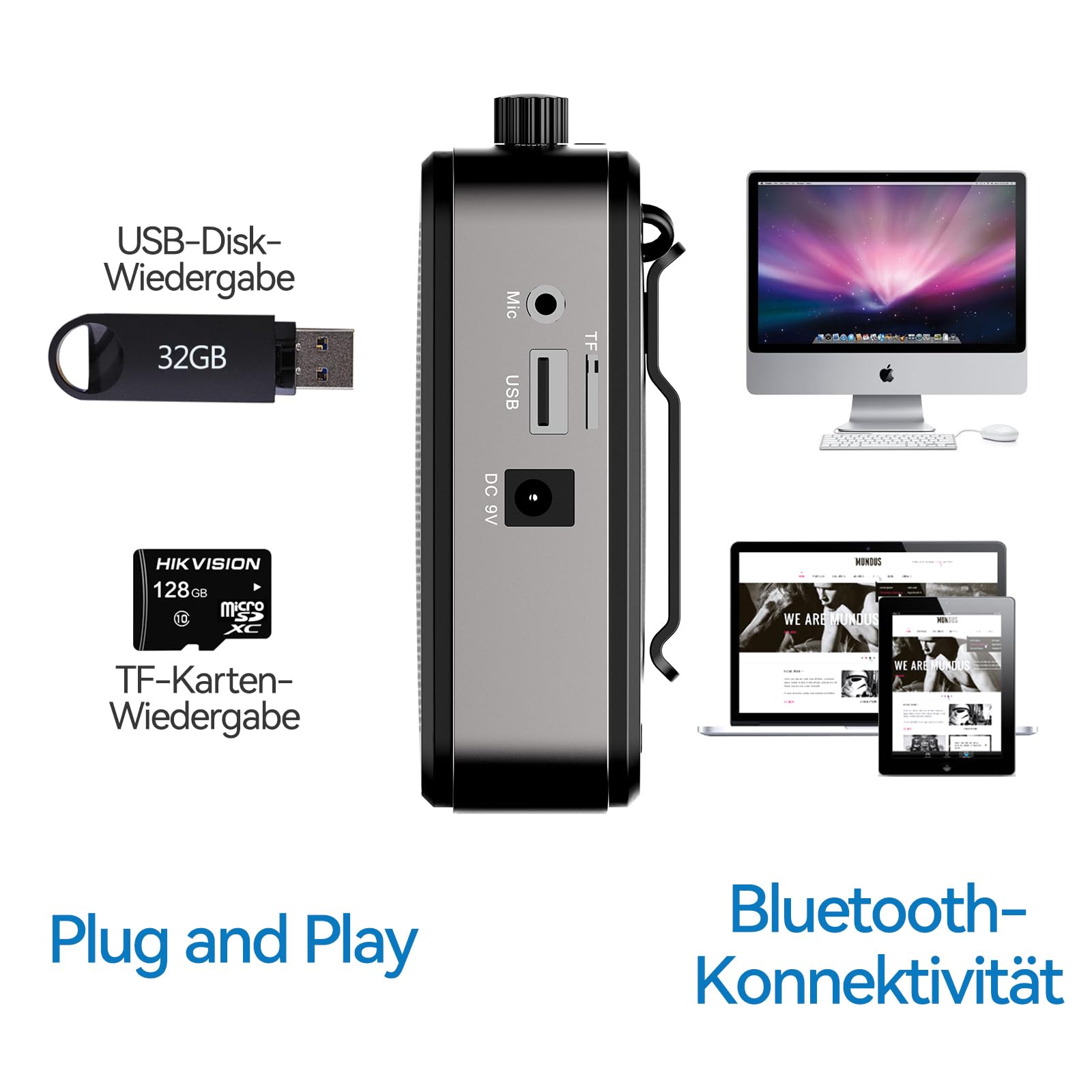 ["【Multifunctional Voice Amplifier】Voice amplifier with microphone headset, can also be used as a radio, recorder, computer and phone speaker, TF card, MP3 player, hall, AUX input, powerful battery, USB, Bluetooth function.","【Long Working Time】The rechargeable voice amplifier is built in a 7.4V/2800mAh large lithium battery with a high safety index and long battery life. You can use it for 14 to 17 hours (MIC mode) and 7 to 11 hours (music mode) with a fully charged battery. The amplifier charging takes 3-5 hours.","【Amplifies Your Voice】The portable voice amplifier with microphone headset is not only a cute voice saver, but also protect your throat to the max with powerful and clear sound (30W). You can use it in multiple places, such as classrooms, subway stations, and outdoors. A good assistant to amplify your voice in your group with over 100+ members.","【Bluetooth Voice Amplifier】The portable voice amplifier with headset, not only an amplifier, but also a portable Bluetooth speaker. You can stream your favorite music from any Bluetooth-enabled mobile device up to 10 meters away.","【Music Playback Supported】This mini Bluetooth voice amplifier with microphone also functions as an MP3 player, supporting TF card (Micro SD Max: 64 GB) and U-disk. The voice amplifier with headset can also be used as a speaker, you can repeat individual melodies, play all music tracks in a loop.","【Quality Guarantee】We guarantee the sale of high-quality voice amplifiers that are rigorously tested before shipping. If you have any questions during use, please contact us and we will provide you with excellent customer service."]