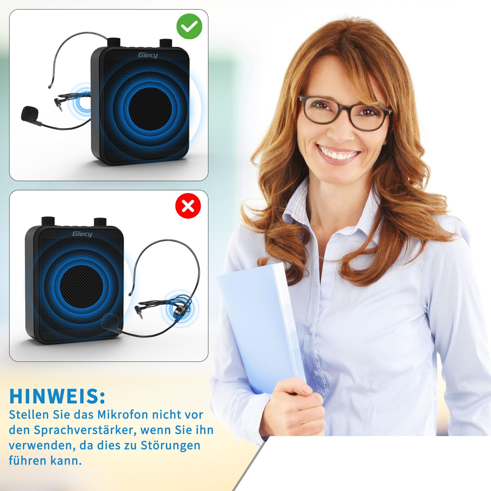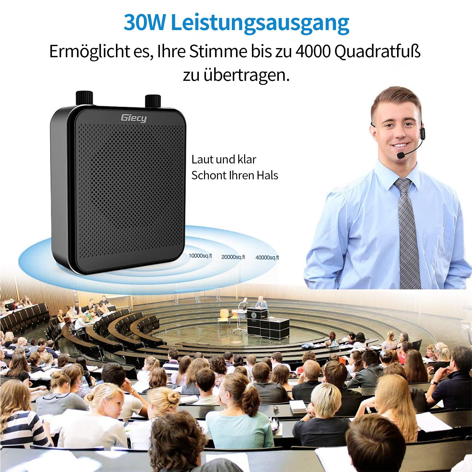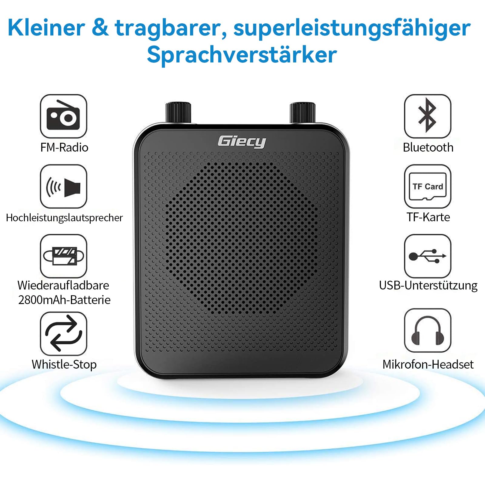 Giecy Portable Bluetooth Speaker (30W) with 7.4V/2800mAh Lithium Battery and microphone headset. Rechargeable mini voice amplifier for trainers, teachers, tour guides, and meetings.
