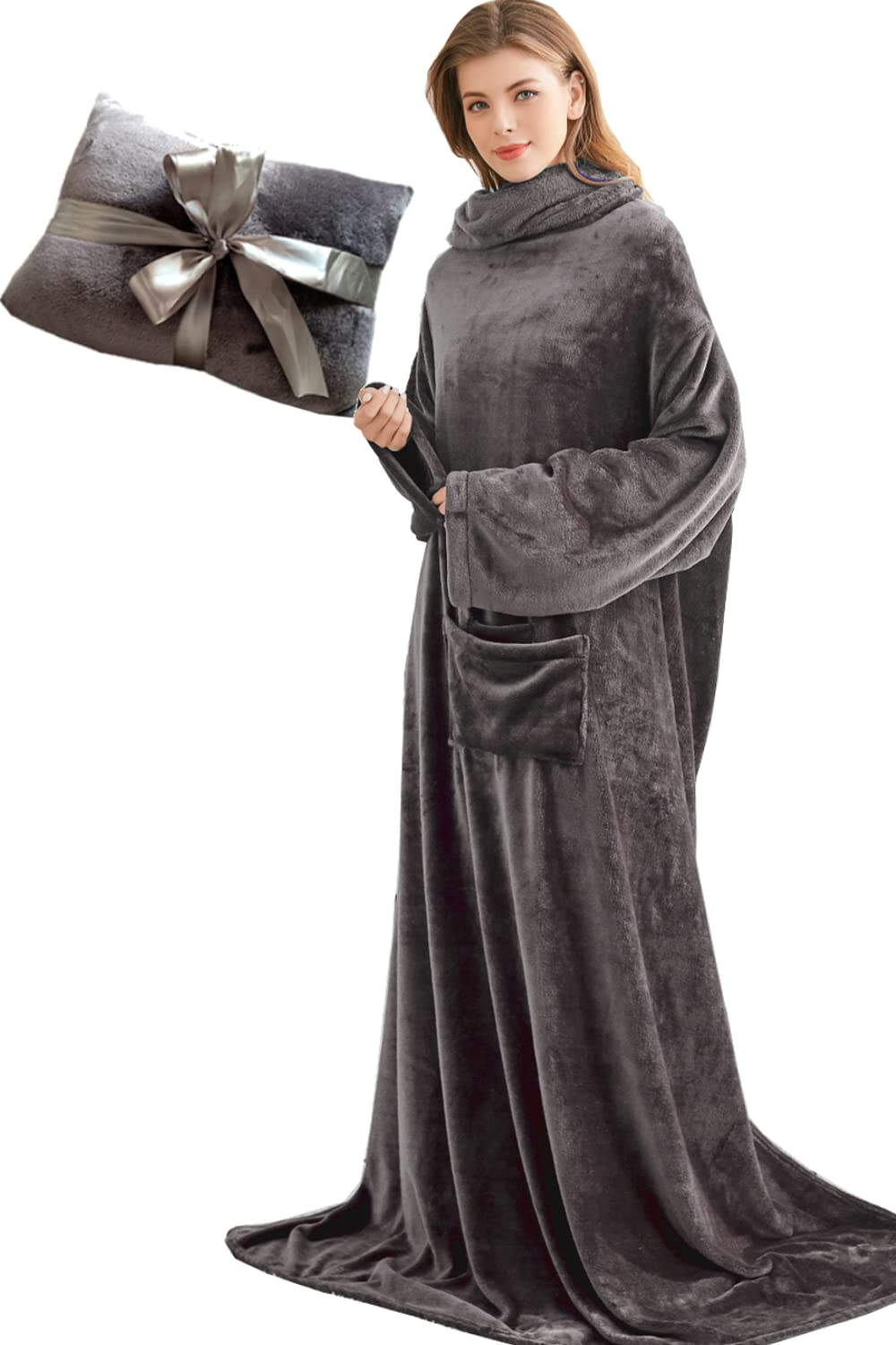 "The cuddly blanket is soft and warm with a Cashmere feel. Wearable and more freedom of movement with sleeves. 2 front belly pockets for phone and snacks.",