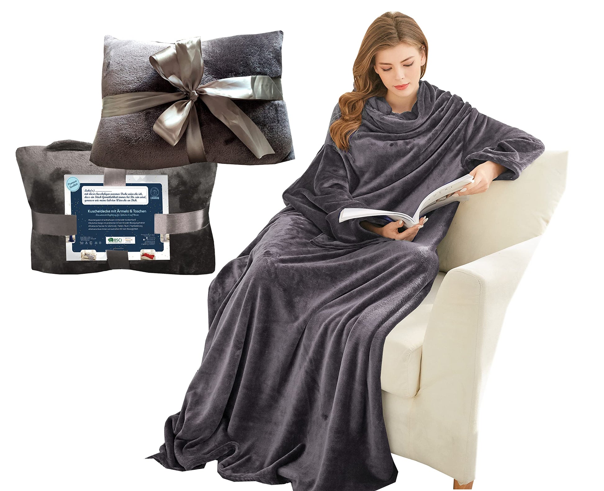Gift for women for Christmas, snug blanket with sleeves, birthday present for mom, sofa blanket 150x200 cm (Dark gray)