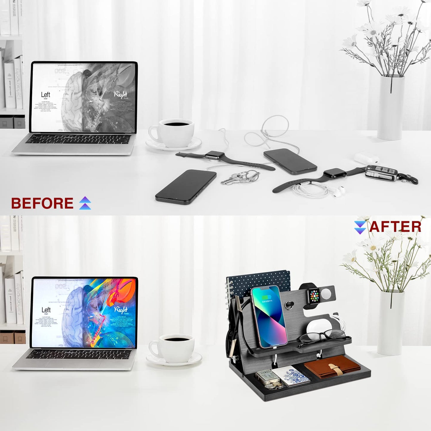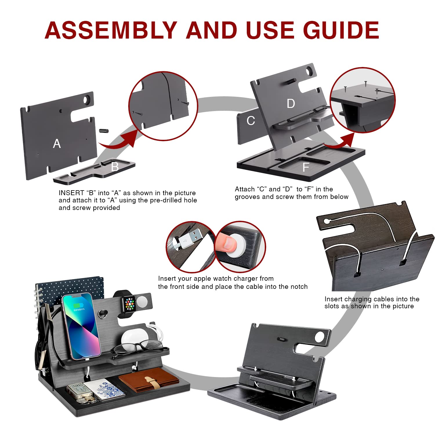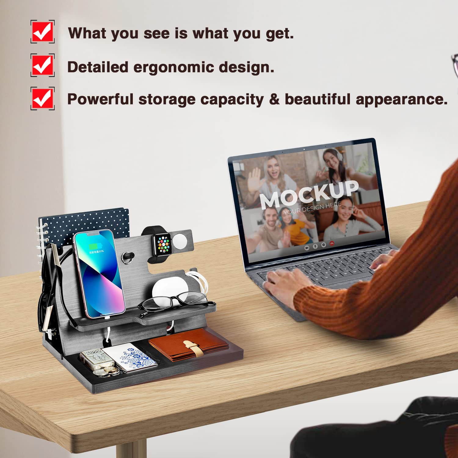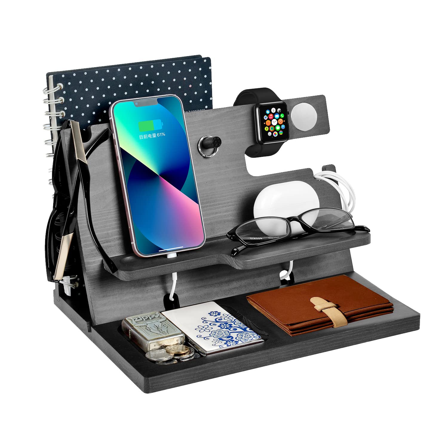 "Desk Organizer: The watch charging stand is only for iPhone iWatch AirPods. The docking station organizer also has compartments for wallets, documents, glasses, watches, fitness trackers, bracelets, keys, rings, coins, stationery, notebook, and other gadgets. Compatible with all types of smartphones. Keep your daily essentials within reach."