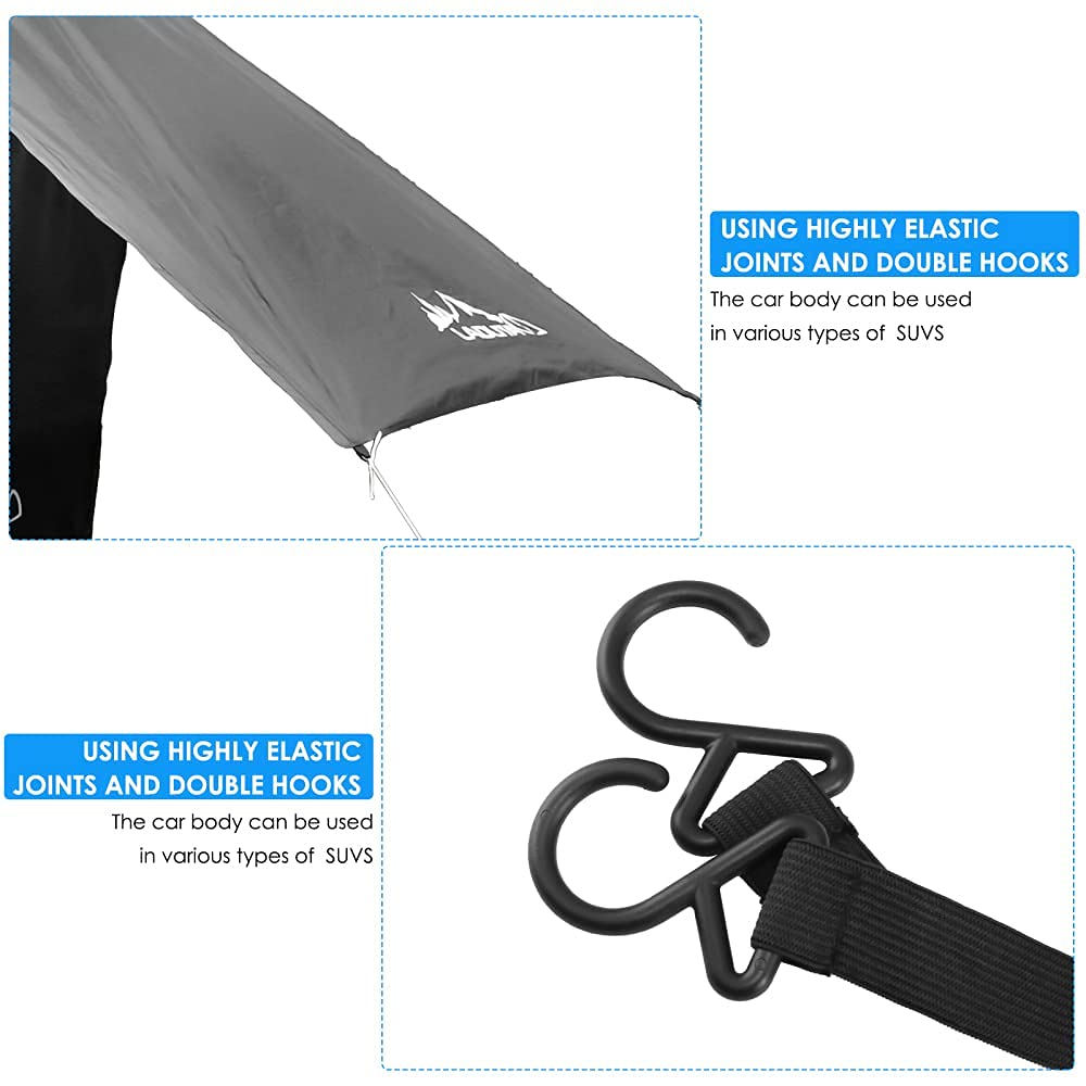 ["【Easy to use and carry】This tent weighs only 900g and comes with a storage bag. Simply lay it on the car and select the appropriate hook to secure the tent. (TIPS: Double hooks, suitable for small and medium CUVs, SUVs, and minivans.)","【Multiple usage scenarios】GJCratfs tent provides a simple and convenient shelter, easy and practical, conforms to the bodywork, is windproof, rainproof, and sun resistant. It is the best choice for BBQ, camping, and fishing!","【Various uses】You can roll up the shade cloth to sleep in the car or enjoy the scenery. Mesh B3 can effectively prevent the entry of various mosquitoes and breathe fresh air; Additionally, laying down the shade cloth, using ground stakes and guy ropes to secure, you can enjoy the joy of camping.","【Windproof and rainproof】The tent fabric is tightly sewn. Each sewing thread is made of waterproof tape with a waterproof index of 3000, which can effectively prevent rain; In addition, it uses silver fabric that can effectively block sunlight and ultraviolet rays. The elastic connector and double-hook design adapt to different body sizes and have better wind resistance.","【Quality Assurance】If you are not satisfied for any reason, please contact us immediately and we will respond within 24 hours."]