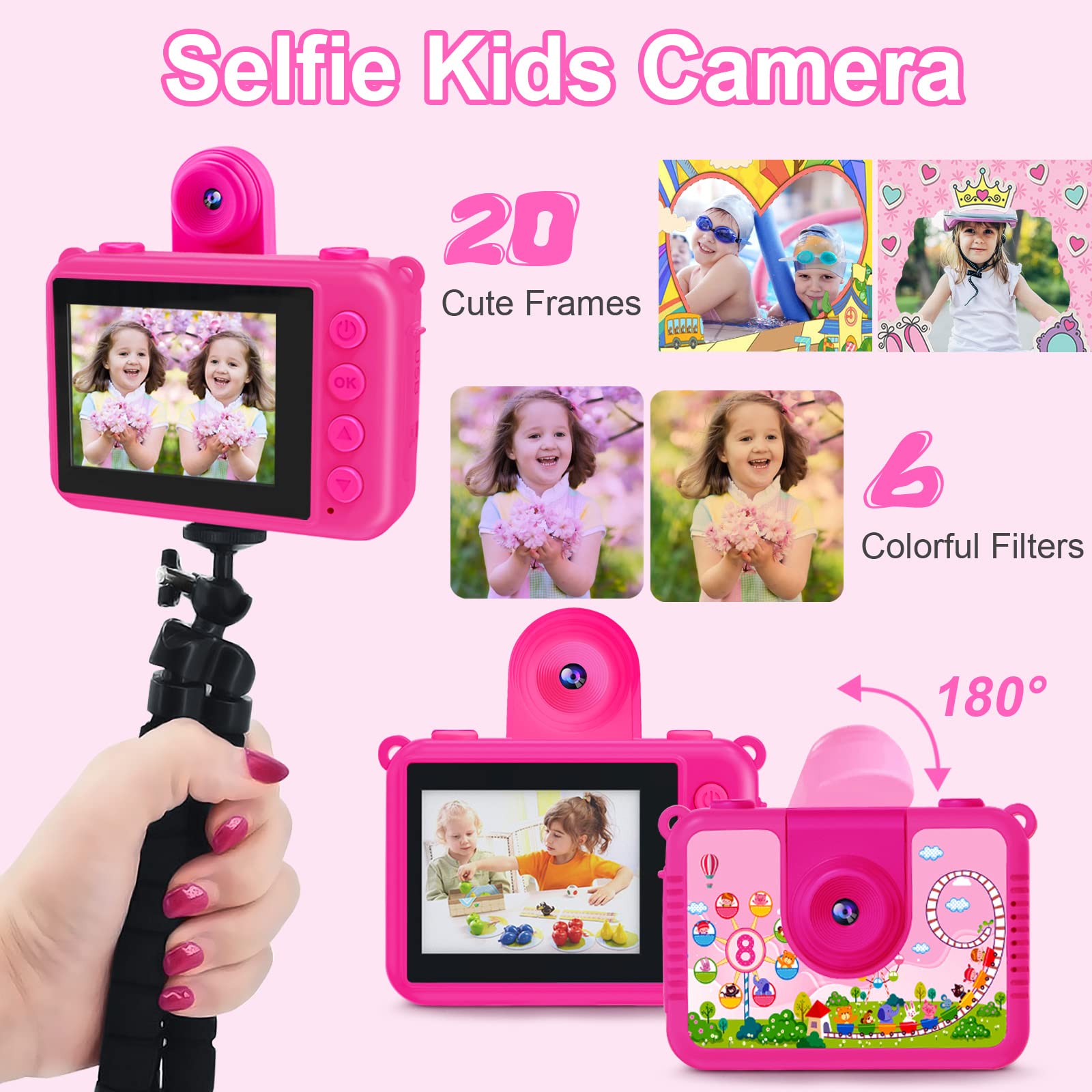 ["Waterproof and shockproof Our waterproof kids camera comes with a waterproof and durable shockproof casing that provides effective protection against falls. Your kids can capture amazing pictures up to 30 meters (100 feet) underwater. The kids camera is easy to install, ideal for your kids to record their brave moments while swimming, skating, biking, and skateboarding.","180° rotation update The toy for 4-12 year old girls is equipped with 20 MP and 1080P video. With a 180° rotation, the kids camera can easily take double front and back shots, allowing your child to capture HD images in all directions. With 20 fun photo frames and 6 filters, kids will have more fun taking selfies.","Powerful battery life The underwater camera for kids can continuously take pictures for 2-2.5 hours after a full charge! The waterproof kids camera comes with a 32GB Micro-SD card, which can store thousands of photos! It includes a video recorder and an audio recorder for more creative playback.","Explore more features Your kids can take the digital camera underwater, its resistance to water pressure makes the recording clearer. The video camera can also be hung around the neck. It's lightweight and convenient. Or you can attach it to the bike handlebar for recording rides. In addition, our girls camera is compatible with most GoPro kits on the market. It's the best adventure toy!","Amazing gift for girls The kids camera for girls is mini-designed and cute. This is absolutely great as a birthday/Christmas/holiday gift for your girls aged 3-14. A perfect introductory toy for girls photography."]
