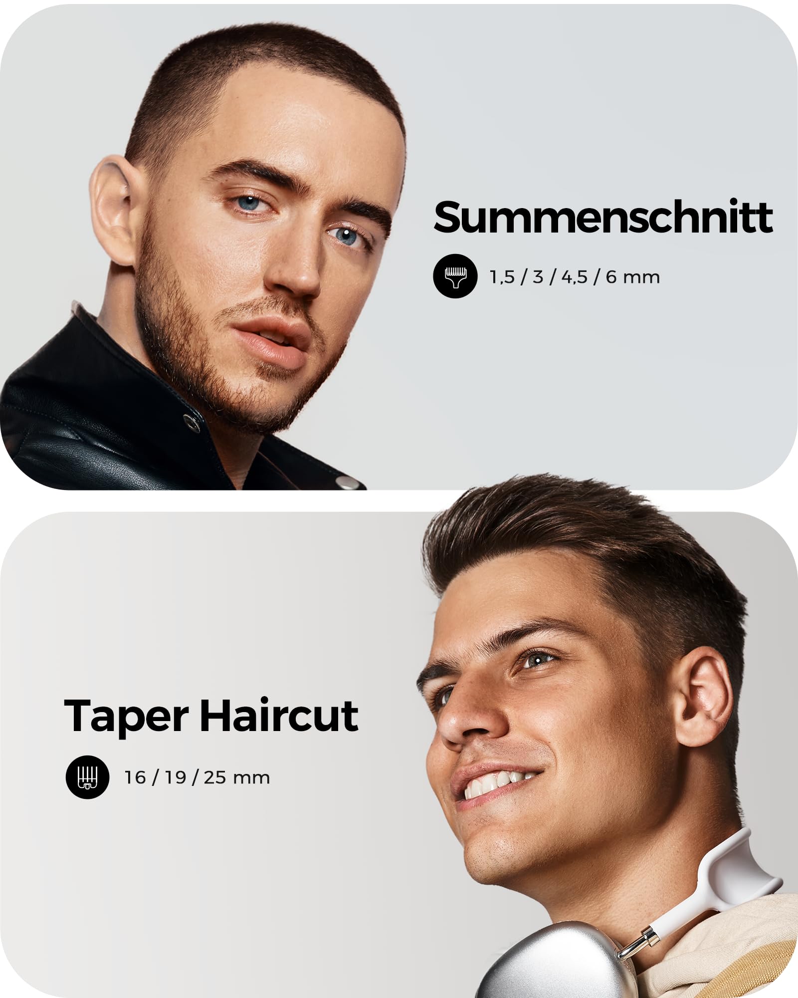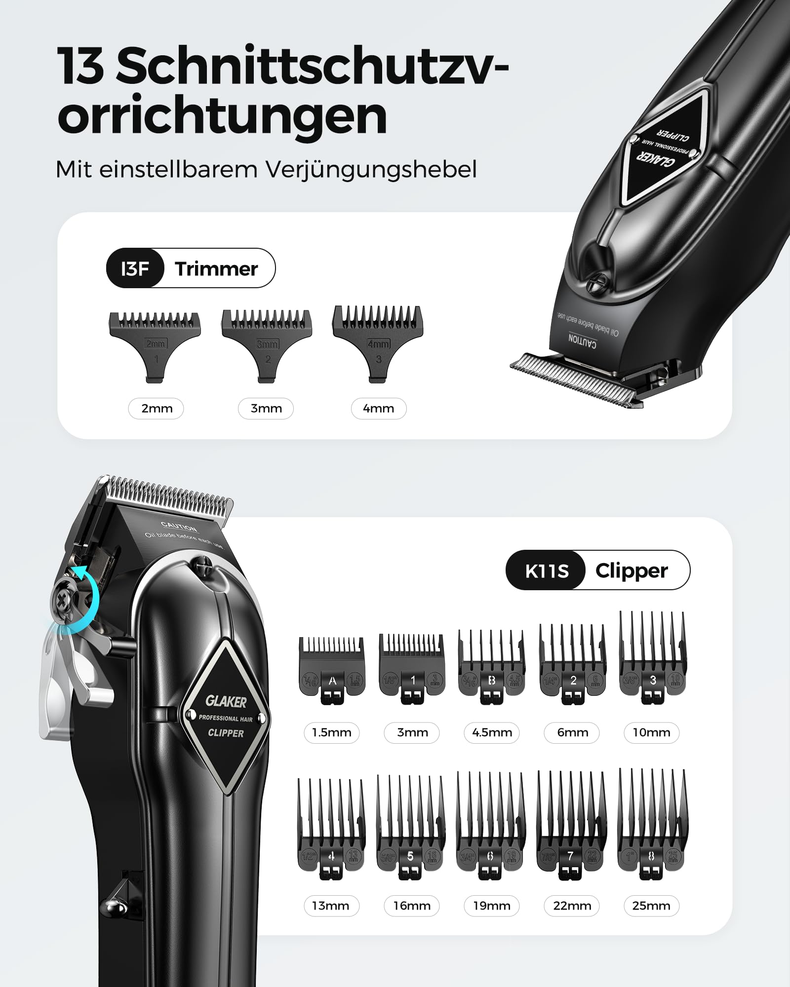 ["THE ONLY BARBER KIT YOU NEED - Say goodbye to your old hair trimmers. The GLAKER K11B+I3F clipper and trimmer combination has the power you need for a hassle-free haircutting experience. With a runtime of 300 minutes, this premium hair clipper is perfect for travel, vacation, and business trips, etc.", "EXCELLENT CLIPPING EXPERIENCE - The cordless hair clipper from GLAKER features a high-performance motor with ample power (6000 rotations per minute) and an operating noise level of under 65 dB, making it suitable for users with different hair types and in different age groups. The 440c stainless steel blades are perfect for people with coarse hair.", "PREMIUM QUALITY ABOVE STANDARD - With this hair clipper, you can enjoy a cutting experience as smooth as butter. The taper lever allows you to adjust the length of the blades, making it easy to fade and blend hair. The precise T-blade ensures clean lines and precise edges when trimming hair, beard, sideburns, and mustache.", "THOUGHTFUL DESIGN - This cordless hair cutting set features an ergonomic metal body with a honeycomb texture on the back of the handle, providing a sturdy and secure grip for professional barbers and stylists. With the large LED display, you can stay updated on the status of this barber set in real-time.", "EXPERIENCE YOUR TRANSFORMATION - GLAKER is an innovative brand that caters to all the needs of the male world. We value the feedback of every customer and strive to provide a fantastic grooming experience. Our commitment to quality and service is unmatched, and we are confident that you will be impressed with the results. If you encounter any grooming issues, we are always ready to assist you."]