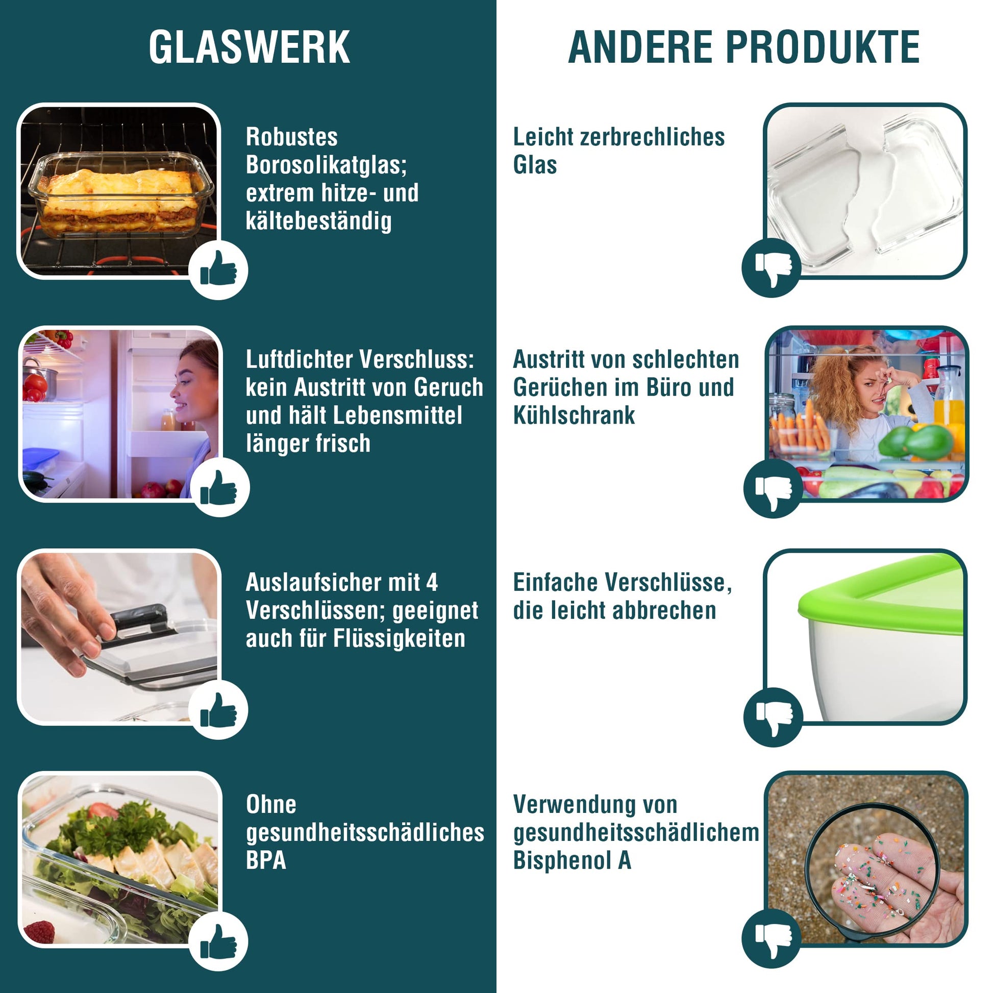 1 LITER CAPACITY - The glass storage container offers enough space for a large, delicious meal. With the containers with lids, you will never have to suffer from hunger at the office again when you have a well-filled glass bowl with a lid from GLASWERK.