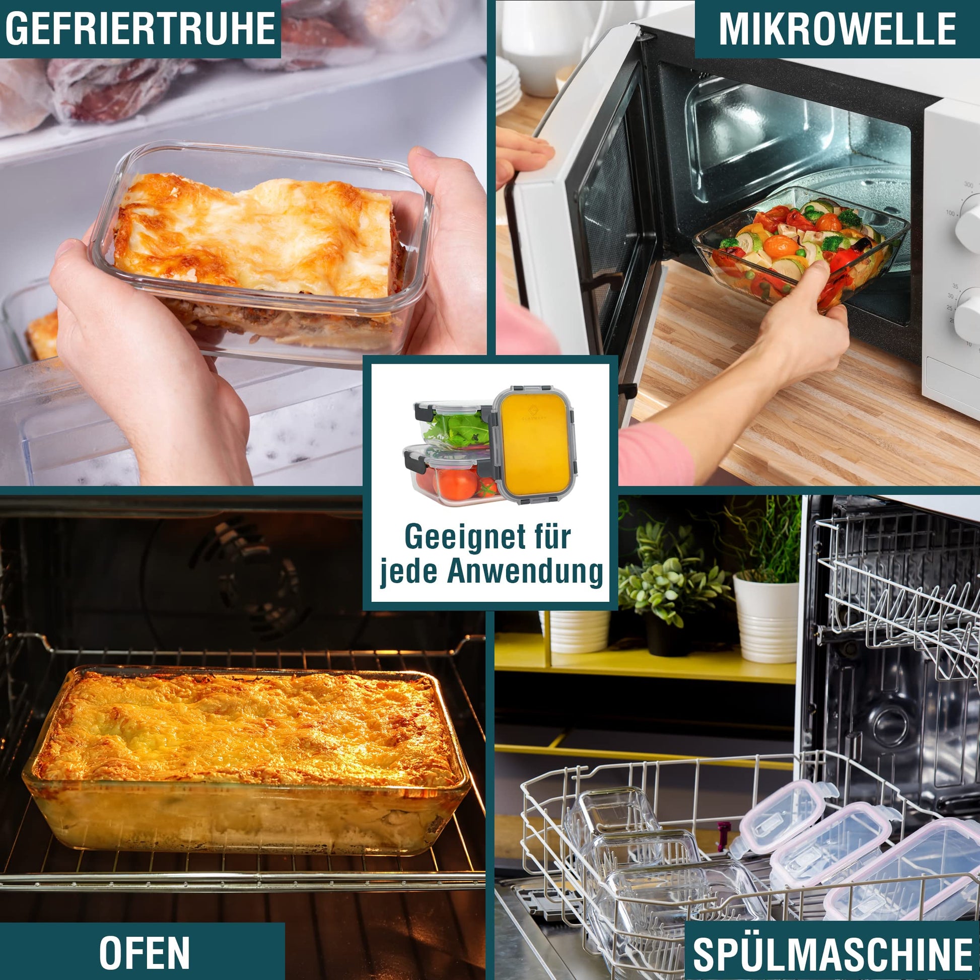 NO ODORS IN THE FRIDGE - The airtight glass container with lid ensures that your fridge does not smell like food. In the meal prep glass, you can store both cooked and raw ingredients."