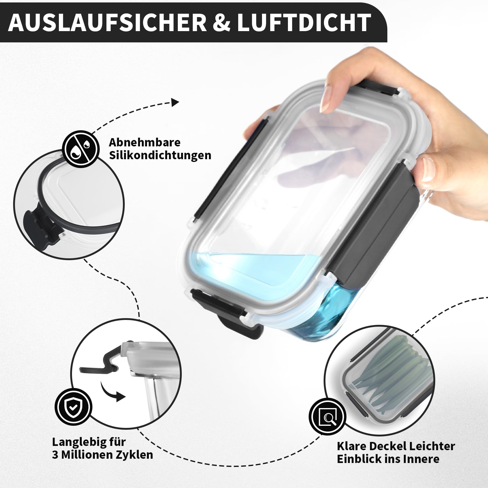 ["20-piece set: Includes 10 glass food containers and 10 matching lids. Sizes/shapes included in the set: rectangular container: 5x370ml, 5x1040ml. Perfect for storing and transporting meals, even for picnics and camping. They are also ideal for use in restaurants, at home, in the office, at school, and in the gym.",