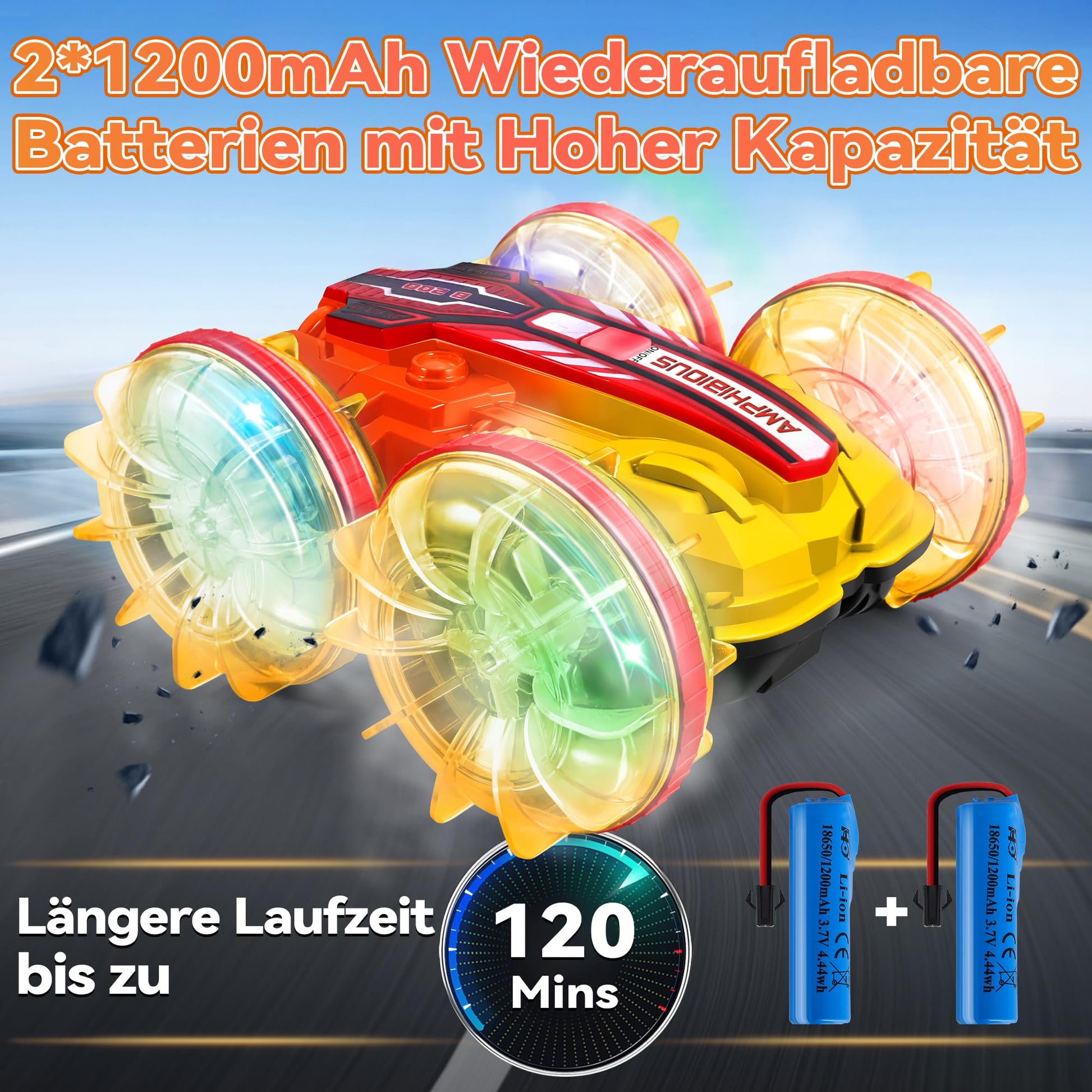 ["🎁【2025 Latest Amphibious Remote Control Vehicle】The remote control car for kids has been upgraded with a waterproof design and 4 new cool LED lights. Its strong performance and numerous functions will provide endless fun for the children!","🎁【2 * Rechargeable High Capacity Batteries】2 * 3.7V 1200mAh rechargeable lithium batteries are included in the remote controlled amphibious vehicle. Each battery can support the RC car for 1 hour of operation. You don't have to wait, your kids can have 2 hours of fun! Very convenient and practical.","🎁【Remote Control】The remote control uses 2.4GHz technology, allowing multiple children to control their car remotely without interference. The RC range is about 40m, easy operation, user-friendly, suitable for users of all ages! (Note: 2 AA batteries for the remote control are not included)","🎁【Perfect Gift for Kids】The waterproof remote control car can not only drive freely on grass, sand, and concrete but also works perfectly in water. Encourage your child to actively participate in outdoor leisure activities. Promotes hand-eye coordination and motor skills. The MVP of birthday gifts for boys and girls.","🎁【100% Satisfaction Guarantee】GLEEHAPY is committed to providing every customer with the highest standard of customer service. If you have any questions about outdoor toys for kids, feel free to contact us. We will answer all questions about the remote control car within 12 hours. In addition, GLEEHAPY outdoor remote control cars offer a one-year warranty."]