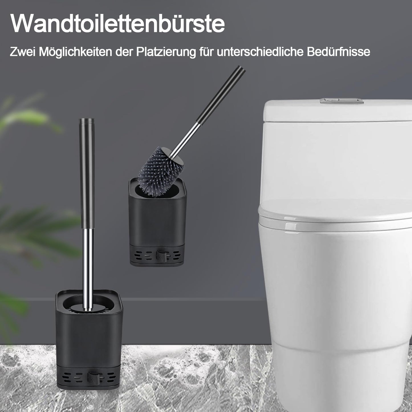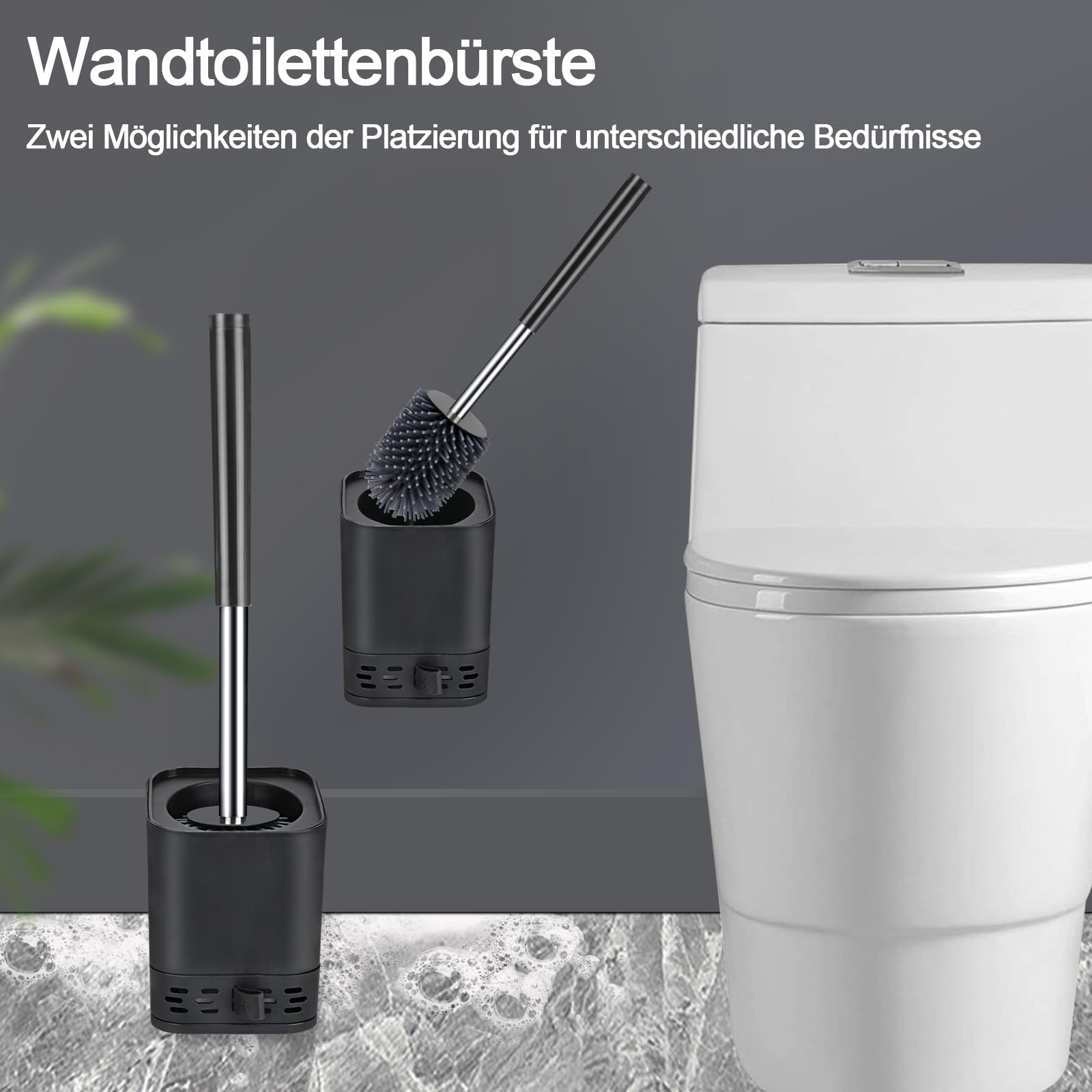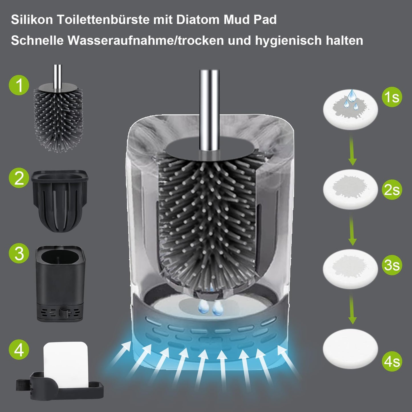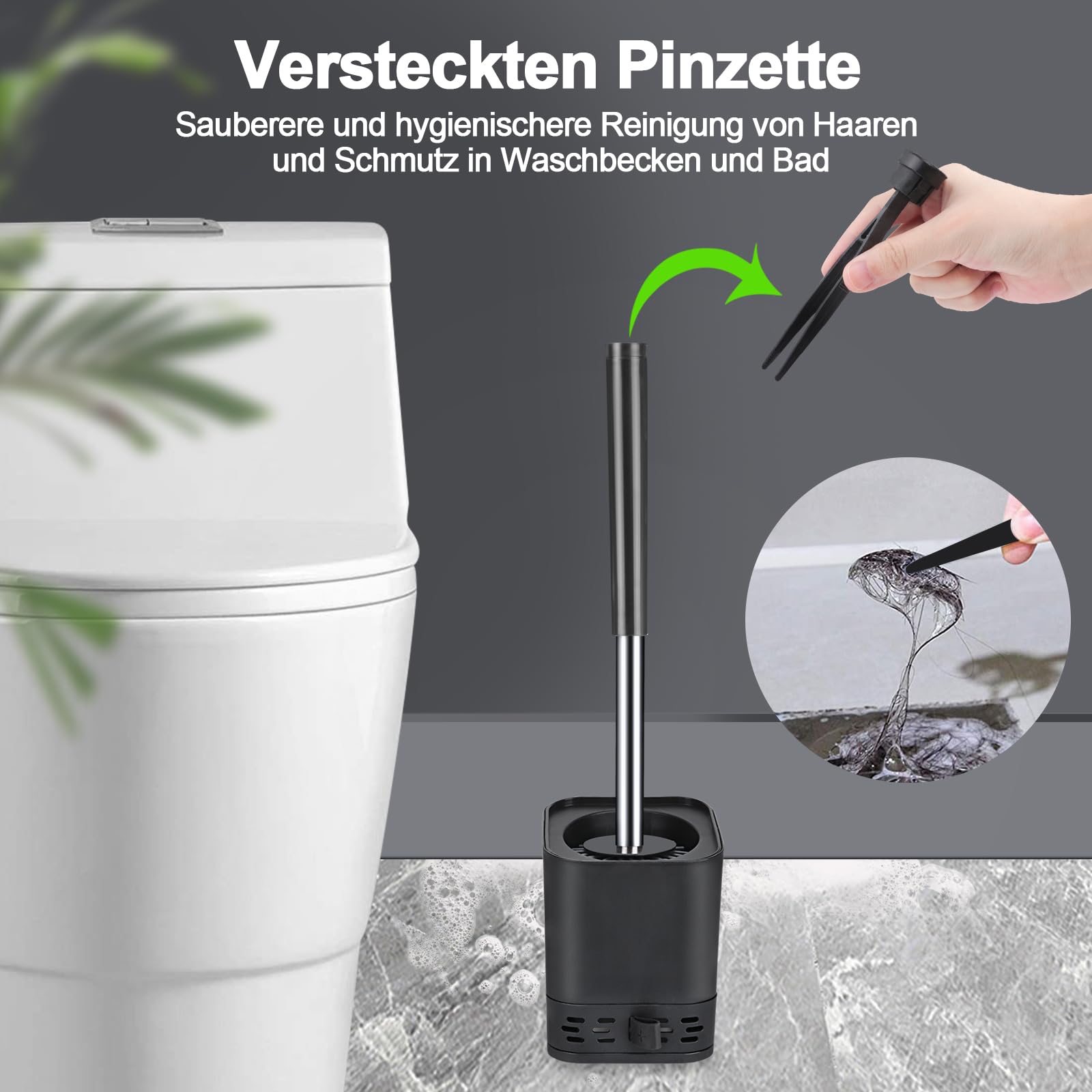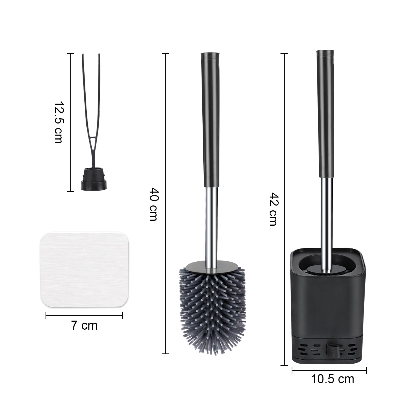 ["High-quality TPR Silicone Brush Head The toilet brush head is made of TPR material, soft and flexible, durable and dense. The toilet brush does not damage the toilet glaze and does not pick up dirt. Even after prolonged use, the toilet brush does not lose its shape.","Efficient Cleaning Our silicone toilet brush has a 360° thick soft brush head to remove stubborn stains under the rim and other hard-to-reach areas.","Quick-drying Toilet Brush Holder The inside of the toilet brush is equipped with a drainage opening and hidden ventilation slots, allowing the water on the brush to evaporate faster, while the water storage drawer with water-absorbing mat absorbs water quickly to prevent overflow and keep your bathroom clean and hygienic.","Hidden Tweezers Our toilet brush comes with hidden cleaning tweezers on the top of the handle. You can easily pull out the tweezers to clean hair and debris on the sink and bathtub without getting your hands dirty and keep the bathroom completely clean.","Wall-mounted & Standing It can be placed with a holder on the floor or attached to the wall with stickers to save space in the bathroom."]