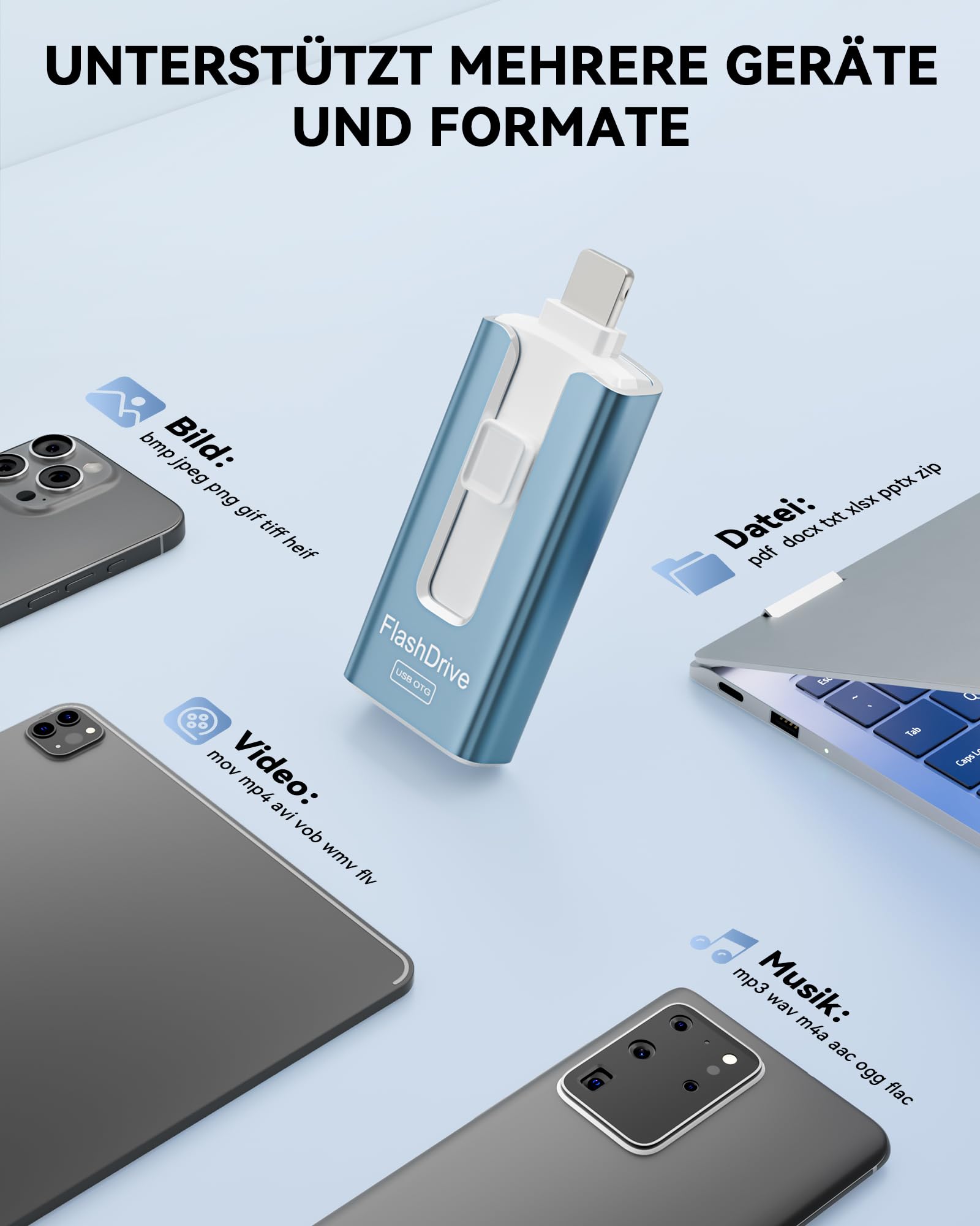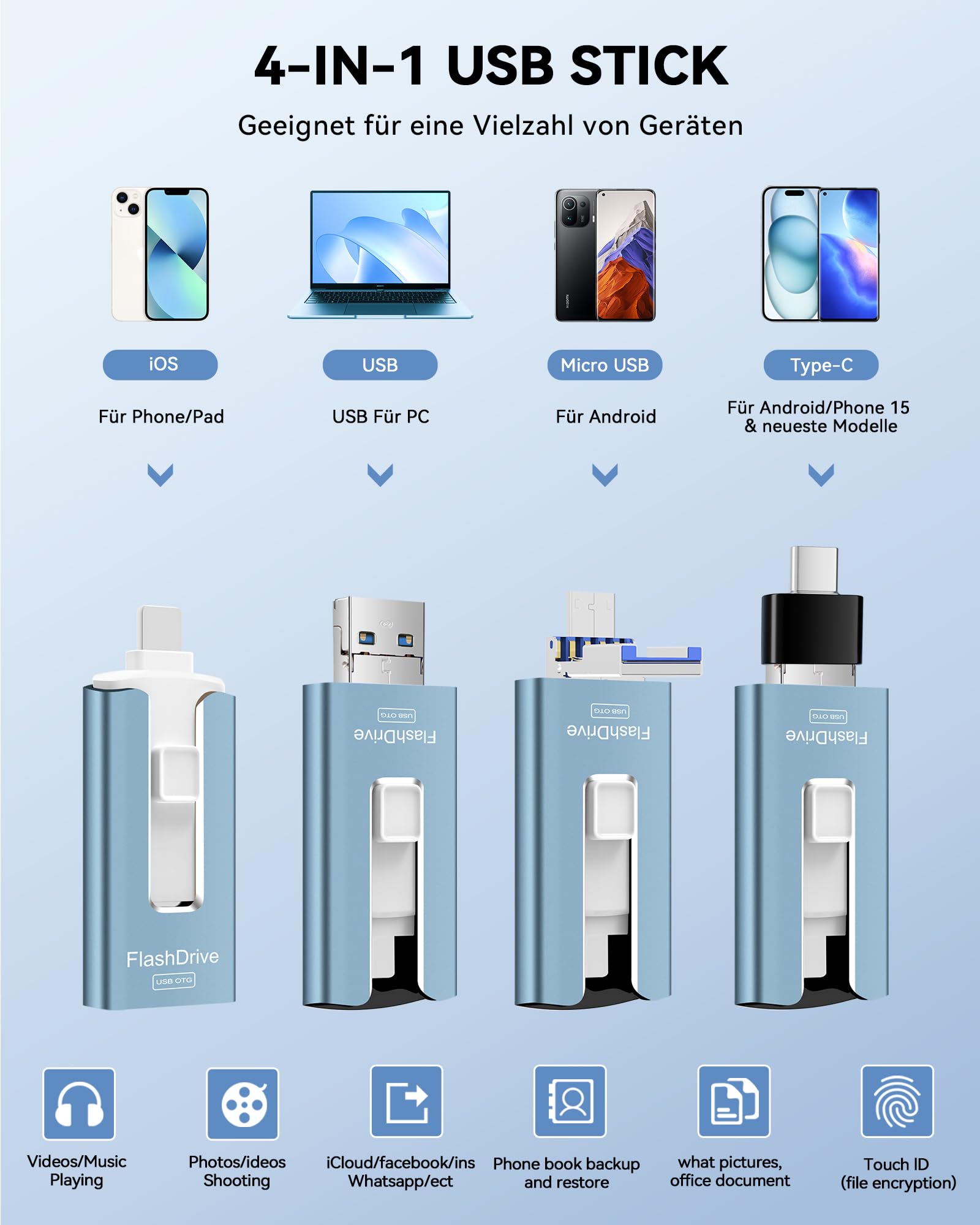 "- 4-in-1 USB Stick: GNASEET USB Stick is compatible with 4 ports: iOS, USB 3.0, USB-C, and Micro USB. Transfer data between different devices with a single flash drive, eliminating the need for data cables, iTunes & iCloud. Compatible with Phone, Pad, Android, Mac, PC, Car, Smart TV. (Supports Phone 16/16 pro/16 pro max, Phone 15/15 pro/15 pro max, 14/14 pro/14 pro max, 13/13 pro/13 pro max, 12/12 pro/12 pro max, 11/11 pro/11 pro max, XS max/XR/XS/X/8/7/6/6s/5/5s)